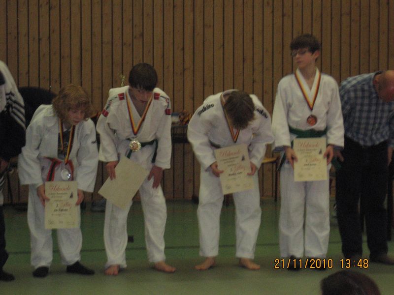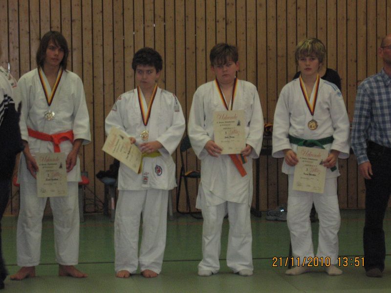 Beim 6.Internationalen Pokal-Turnier „dr Holzmichel“ holte sich Richard Fiedler (-42kg) in der Altersklasse U13 am 21.November 2010 mit hervorragenden Leistungen verdientermaßen die Goldmedaille. Der in der gleichen Gewichtsklasse startende Vereinskamerad Jakob Lindner komplettierte die Erfolgsbilanz mit der Bronzemedaille. Kevin Wächtler erkämpfte sich in seiner Gewichtsklasse ebenfalls eine Bronzemedaille. Krankheitsbedingt war diesmal wirklich nicht mehr drin und alles in allem war es eine gute kämpferische Leistung von Kevin. Theodor Rößler (-38kg) kam bei diesem Turnier nicht so richtig zurecht. Für ihn reichte es am Ende nur für Rang 5. In der Altersklasse U17 stand für den JUDO-CLUB Gornau e.V. Danilo Noack auf der Matte. Danilo konnte seinen Gegnern, hauptsächlich Träger des braunen Gürtels, nicht viel entgegen setzen. Er musste sich bei 11 Teilnehmern in seiner Gewichtsklasse mit Platz 7 begnügen.