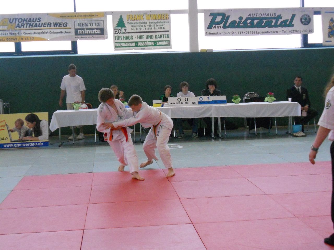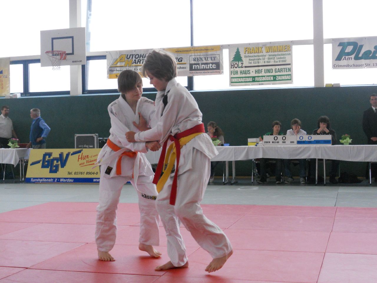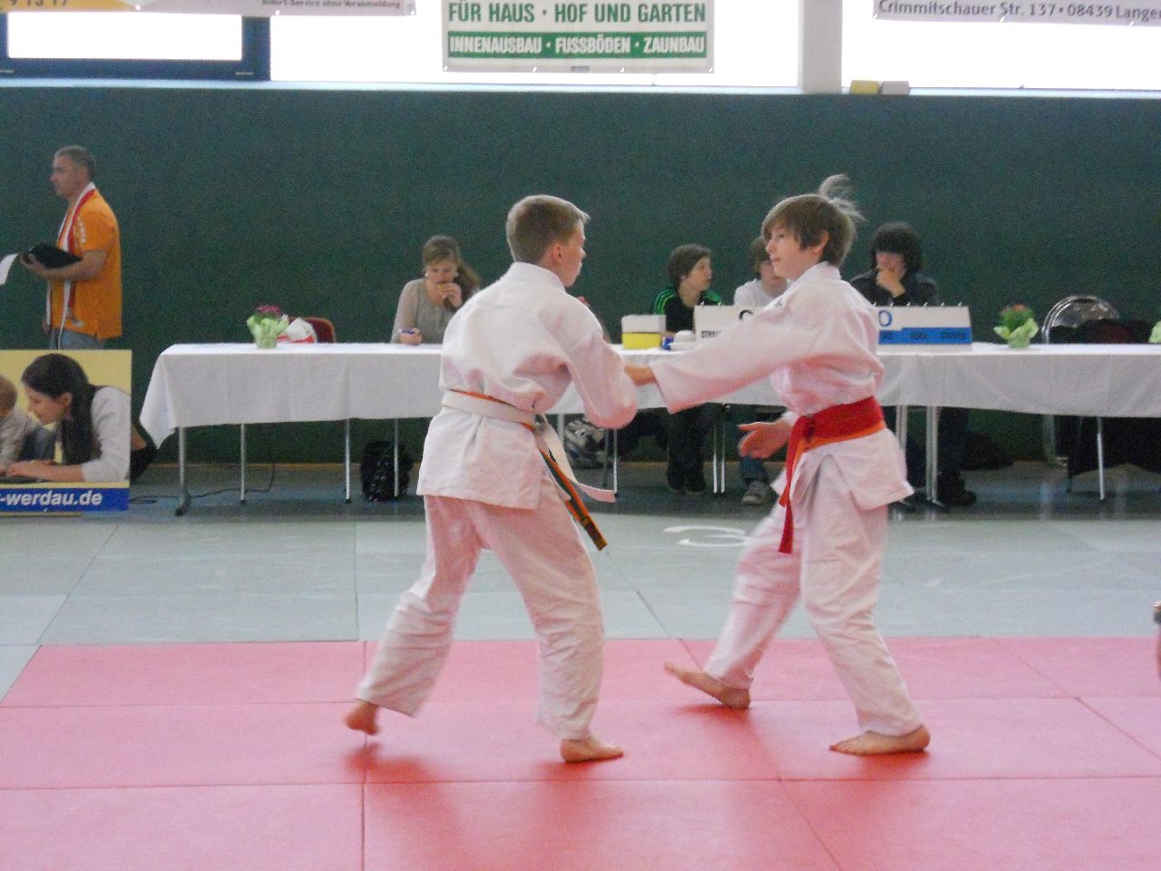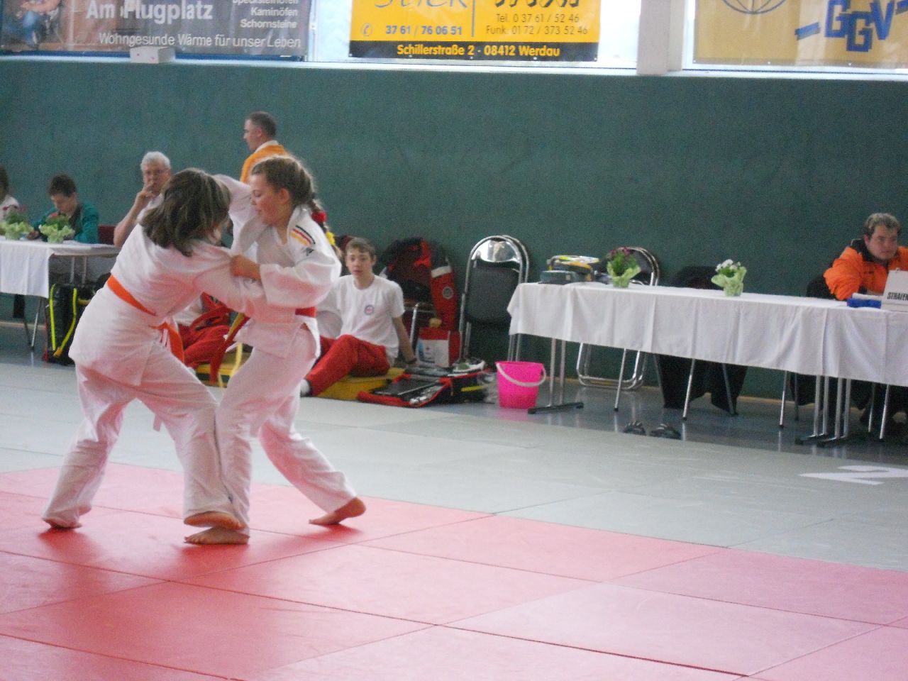 Pünktlich 10.00 Uhr wurde mit den Wettkämpfen in den kleinen Altersklassen begonnen. In der U12 stellten wir diesmal nur ein Mädchen und einen Jungen auf die Matte. Bei Beiden war die Auswahl goldrichtig. Maya Scharnbeck (-44kg) und Georg Müller (-50kg) zeigten sehr guten Kampfgeist und dem entsprechend gute Techniken. Maya konnte alle Gegnerinnen aus Werdau, Mittwaida, Schlettau und vom Chemnitzer PSC besiegen und holte verdientermaßen Gold. Ebenso Georg Müller, welcher auf seinem Weg zum obersten Treppchen Kämpfer aus Dresden, Altenburg und Hagenwerder hinter sich ließ.