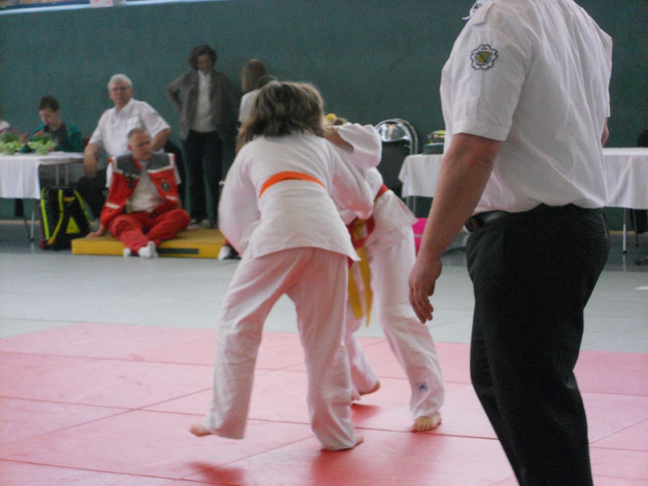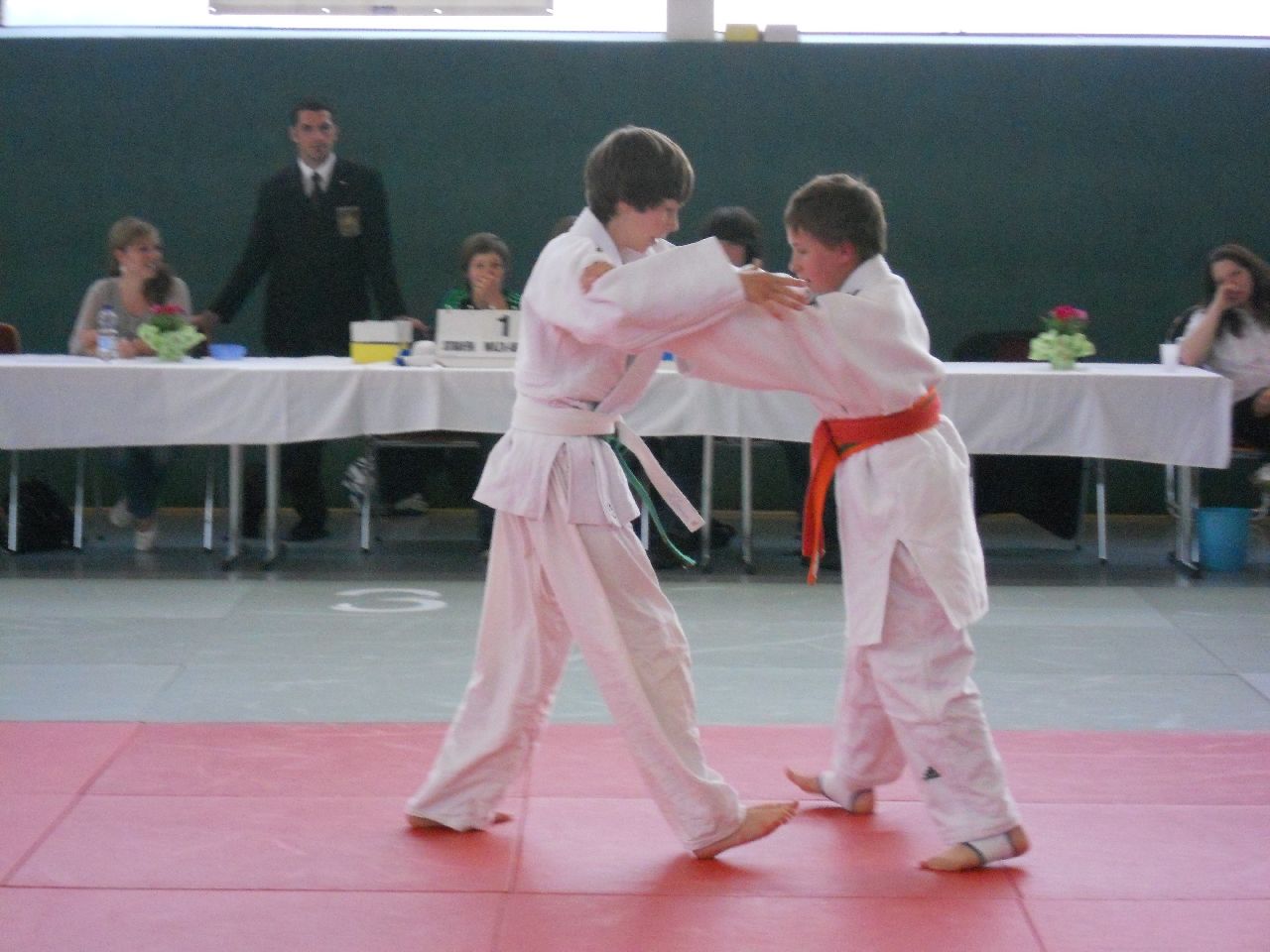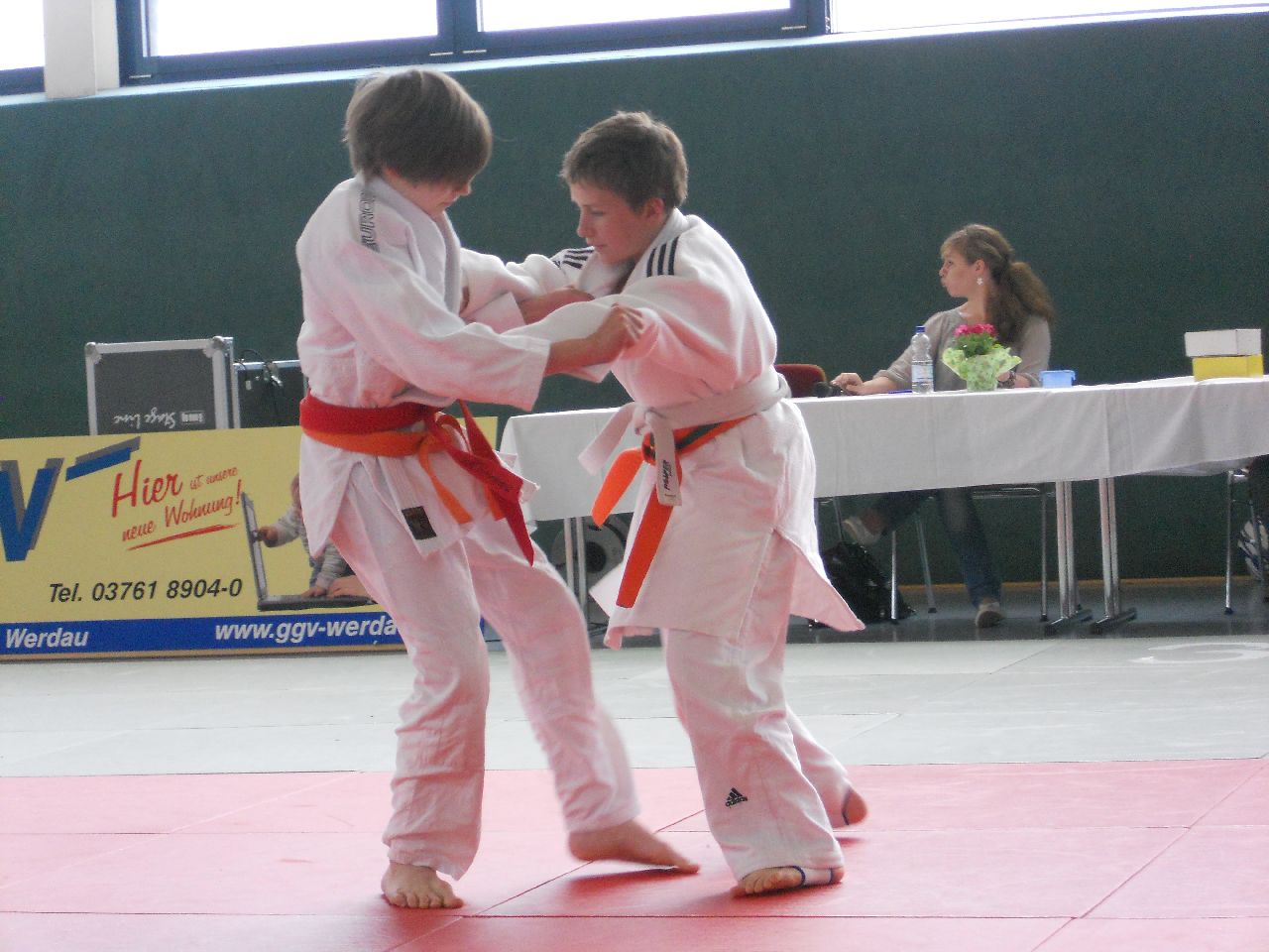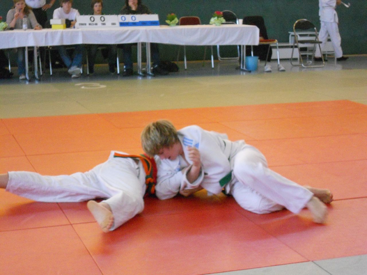 Pünktlich 10.00 Uhr wurde mit den Wettkämpfen in den kleinen Altersklassen begonnen. In der U12 stellten wir diesmal nur ein Mädchen und einen Jungen auf die Matte. Bei Beiden war die Auswahl goldrichtig. Maya Scharnbeck (-44kg) und Georg Müller (-50kg) zeigten sehr guten Kampfgeist und dem entsprechend gute Techniken. Maya konnte alle Gegnerinnen aus Werdau, Mittwaida, Schlettau und vom Chemnitzer PSC besiegen und holte verdientermaßen Gold. Ebenso Georg Müller, welcher auf seinem Weg zum obersten Treppchen Kämpfer aus Dresden, Altenburg und Hagenwerder hinter sich ließ.