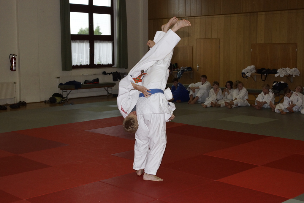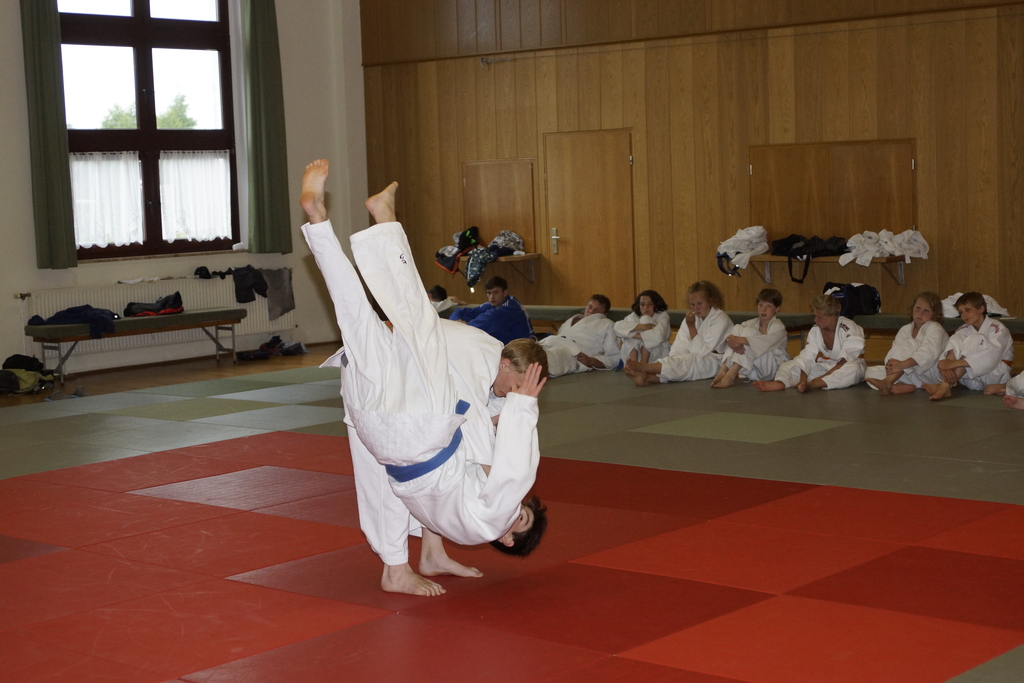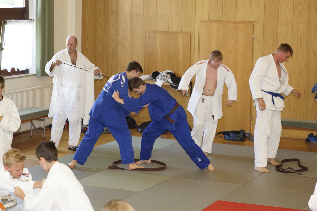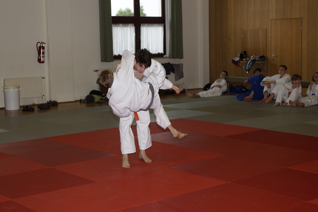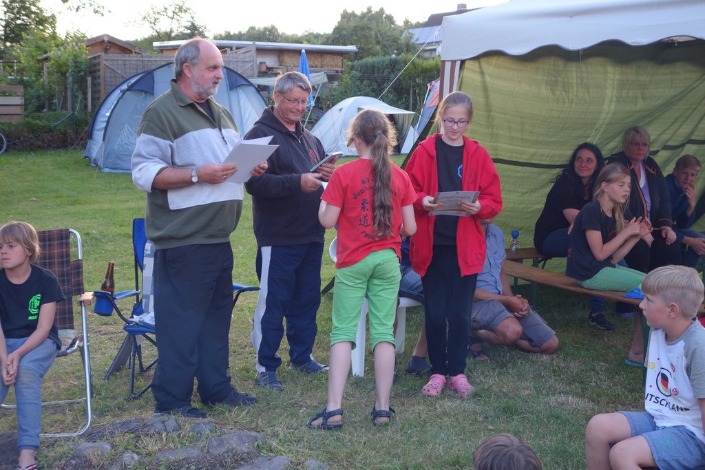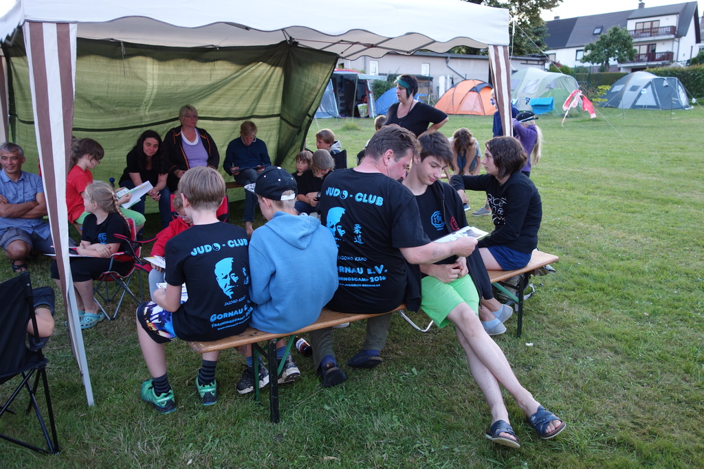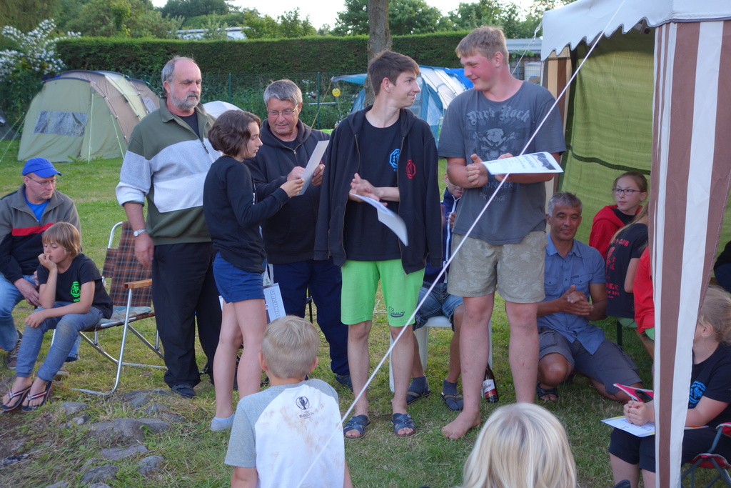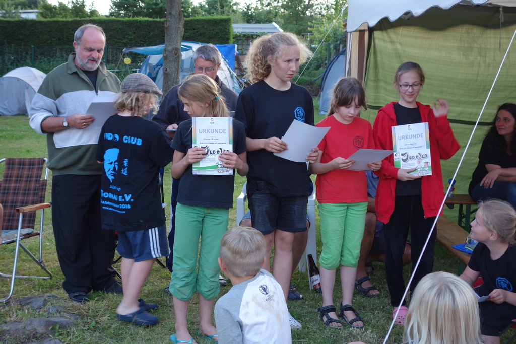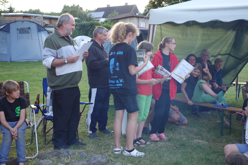 Dann ging es für die Ersten zur Kyu-Prüfung. Geprüft wurden die Anwärter auf den 8. (Gürtel weiß/ gelb), den 7. (Gürtel gelb) und den 6.Kyu (Gürtel gelb/orange). Zwei „Experten“, welche den gelben Gürtel ablegen wollten, dürfen dies im Herbst noch einmal probieren und die vier Kandidaten, welche sich für den 6.Kyu vorstellten, durften dies am Nachmittag noch einmal versuchen. Nach dem Mittagessen und einer Mittagsruhe wurden dann die höheren Kyu-Grade abgefragt. Vom orangenen Gürtel (V.Kyu) bis zu braunen Gürtel (I.Kyu) war alles dabei. Und natürlich die vier Prüflinge vom Vormittag. Diese schafften es diesmal und dürfen nun den gelb-orangen Gürtel tragen. Alle anderen Prüflinge zeigten gute bis sehr gute Leistungen und haben ihre Prüfungen mit Bravour bestanden. Mit Patricia Sprunk hat der JC Gornau in seinen Reihen die bisherige jüngste Trägerin des I.Kyu (brauner Gürtel). Für die Eltern der Kinder hatten das Orga-Team um Stephan Henz etwas Besonderes vorbereitet. So konnte, wer wollte, von Sonnabend bis Montag jeweils für eine Stunde ein Kurs in Selbstverteidigung absolviert werden. Dieses Angebot wurde dankbar und in großer Anzahl in Anspruch genommen. Nach dem Abendbrot, einer zünftigen Soljanka, wurden an die Prüflinge die Urkunden für den neuen Kyu-Grad überreicht und danach schaute man dann einen Film über das Lagerthema.