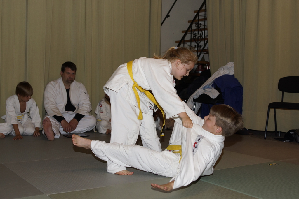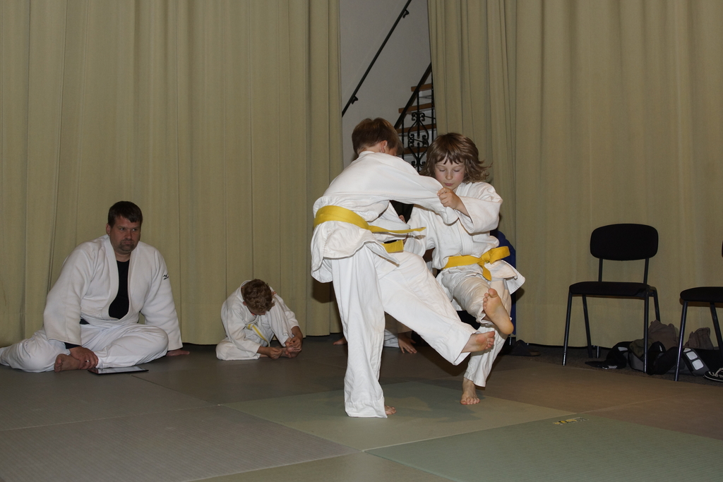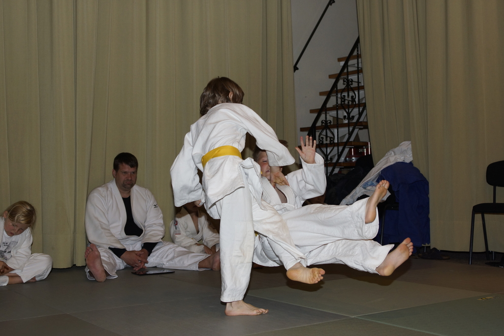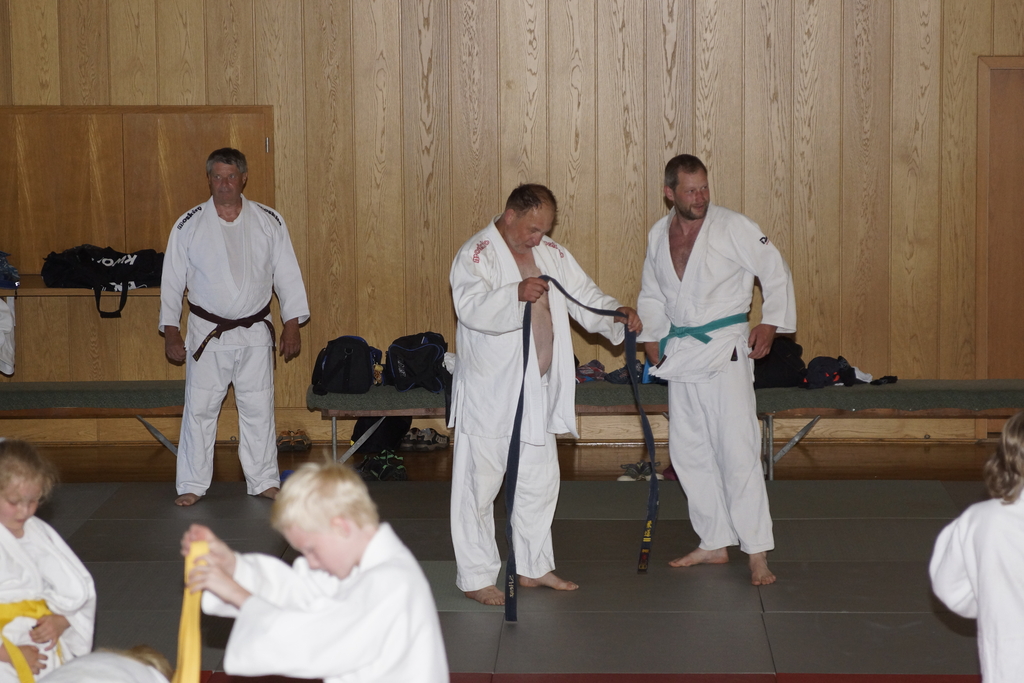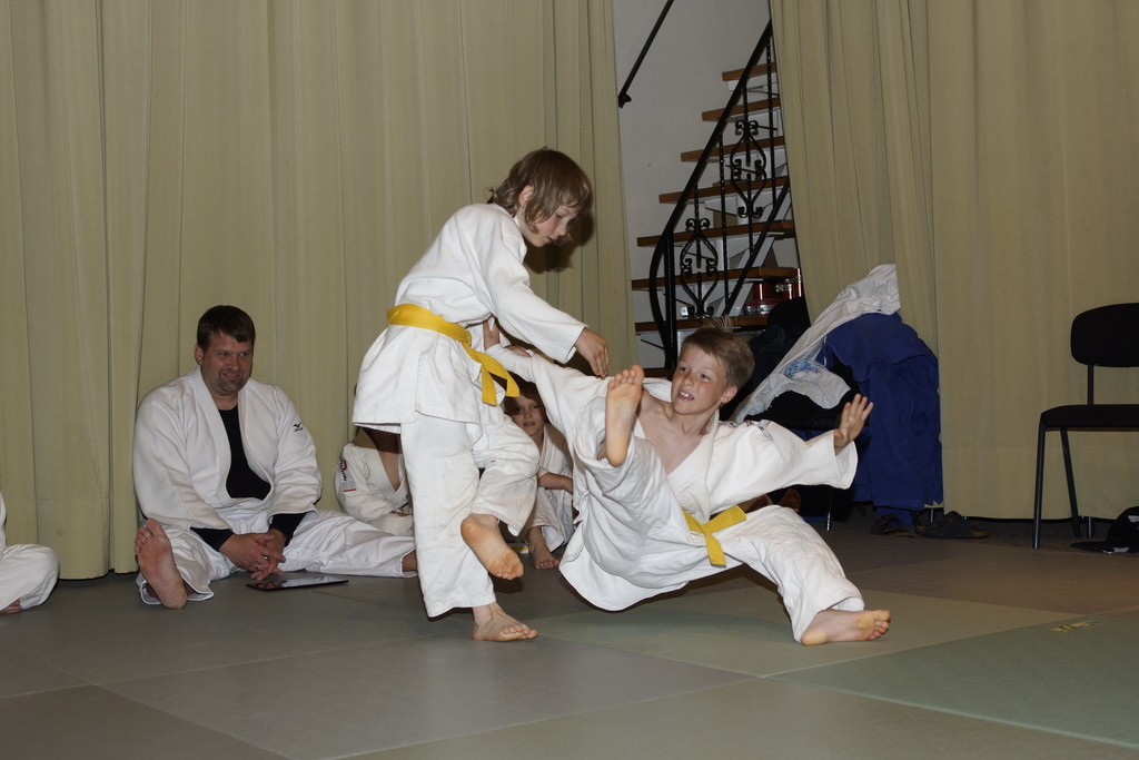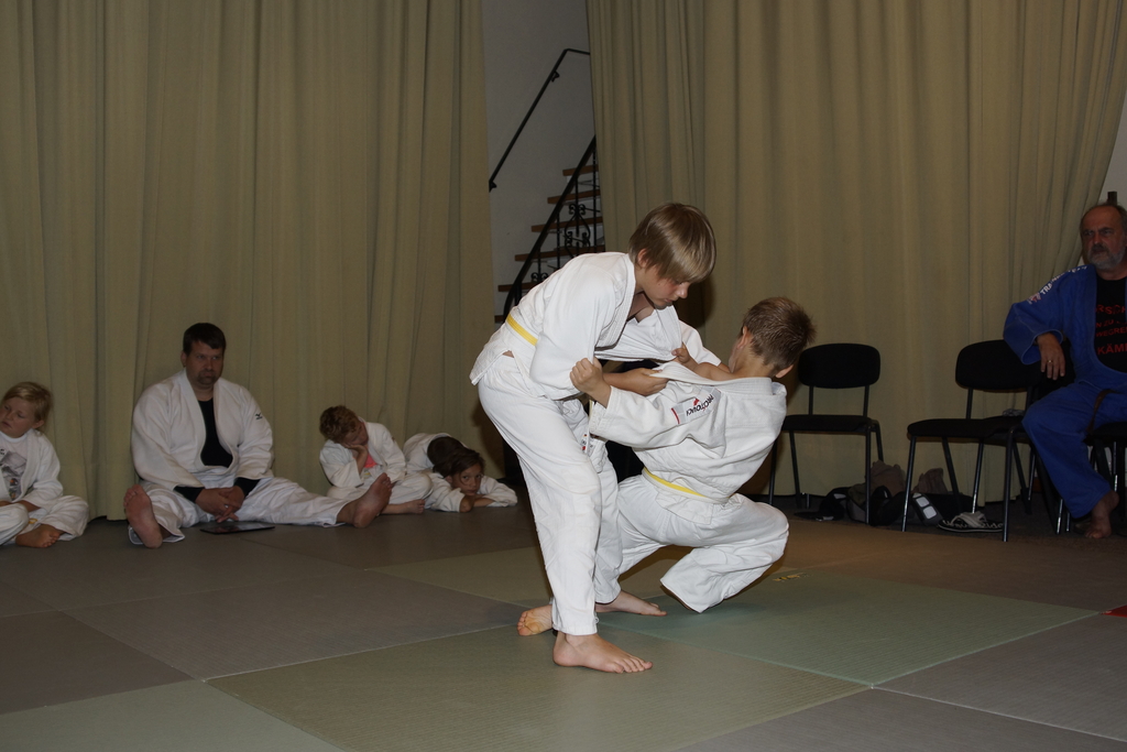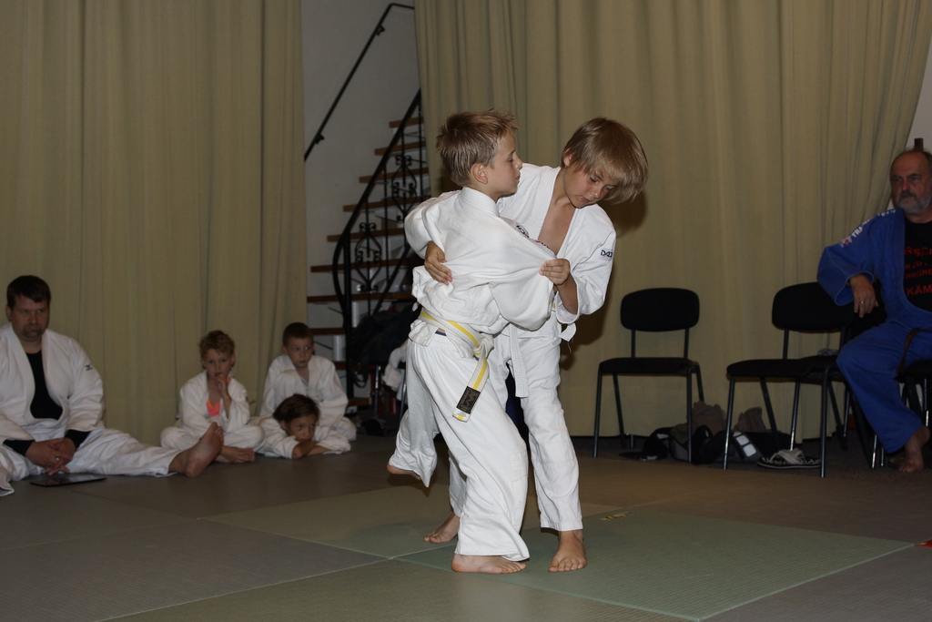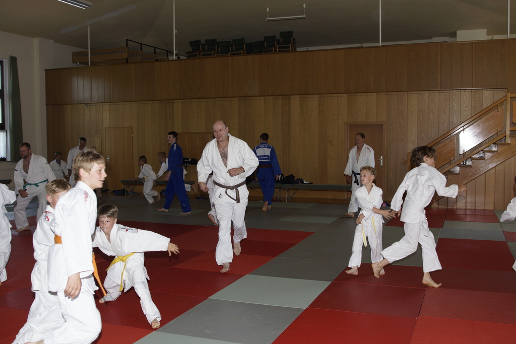 Dann ging es für die Ersten zur Kyu-Prüfung. Geprüft wurden die Anwärter auf den 8. (Gürtel weiß/ gelb), den 7. (Gürtel gelb) und den 6.Kyu (Gürtel gelb/orange). Zwei „Experten“, welche den gelben Gürtel ablegen wollten, dürfen dies im Herbst noch einmal probieren und die vier Kandidaten, welche sich für den 6.Kyu vorstellten, durften dies am Nachmittag noch einmal versuchen. Nach dem Mittagessen und einer Mittagsruhe wurden dann die höheren Kyu-Grade abgefragt. Vom orangenen Gürtel (V.Kyu) bis zu braunen Gürtel (I.Kyu) war alles dabei. Und natürlich die vier Prüflinge vom Vormittag. Diese schafften es diesmal und dürfen nun den gelb-orangen Gürtel tragen. Alle anderen Prüflinge zeigten gute bis sehr gute Leistungen und haben ihre Prüfungen mit Bravour bestanden. Mit Patricia Sprunk hat der JC Gornau in seinen Reihen die bisherige jüngste Trägerin des I.Kyu (brauner Gürtel). Für die Eltern der Kinder hatten das Orga-Team um Stephan Henz etwas Besonderes vorbereitet. So konnte, wer wollte, von Sonnabend bis Montag jeweils für eine Stunde ein Kurs in Selbstverteidigung absolviert werden. Dieses Angebot wurde dankbar und in großer Anzahl in Anspruch genommen. Nach dem Abendbrot, einer zünftigen Soljanka, wurden an die Prüflinge die Urkunden für den neuen Kyu-Grad überreicht und danach schaute man dann einen Film über das Lagerthema.
