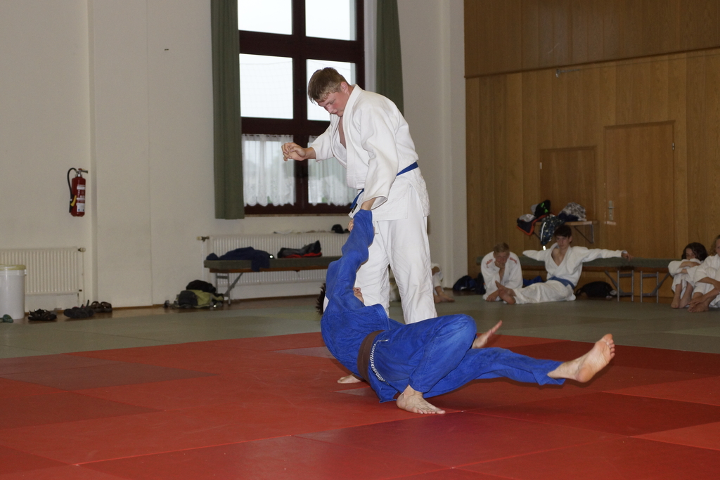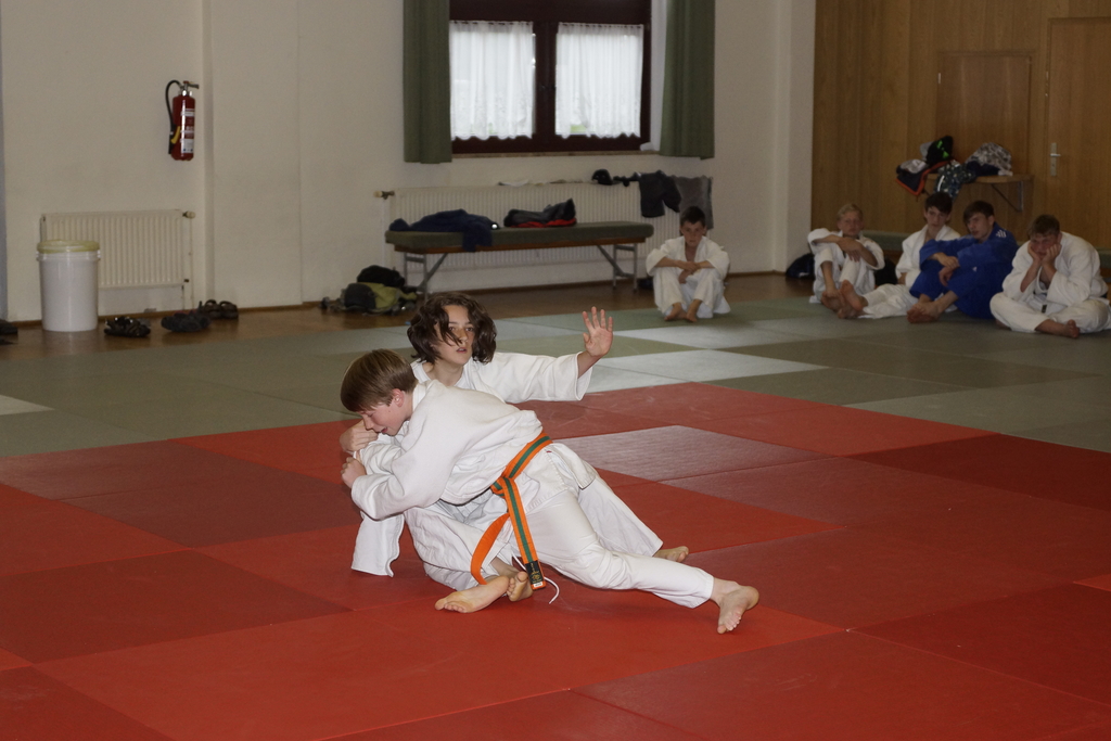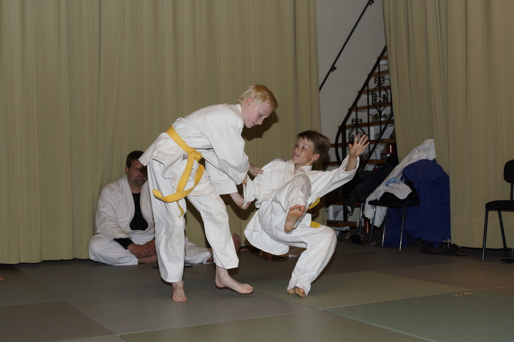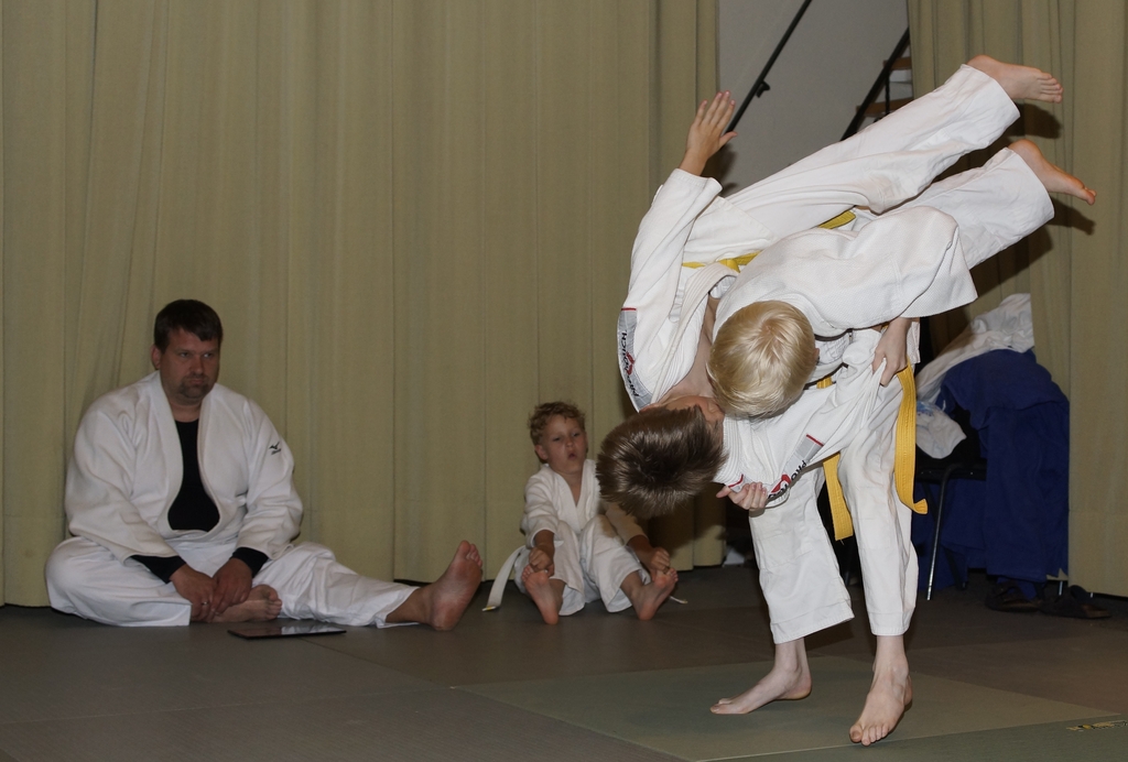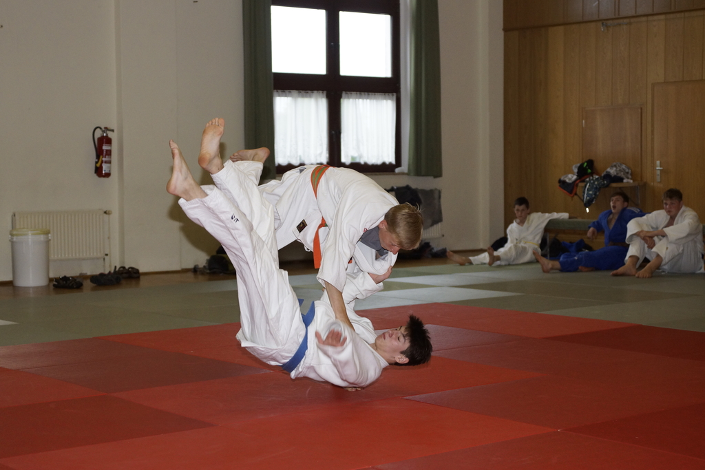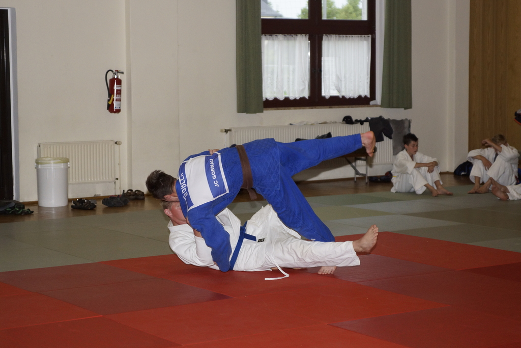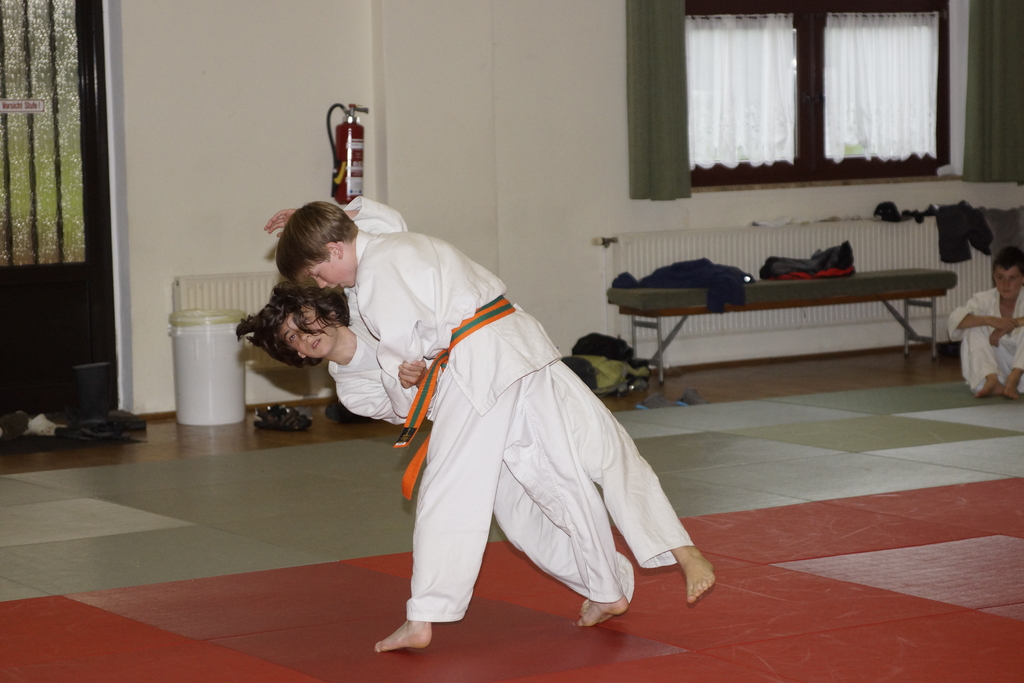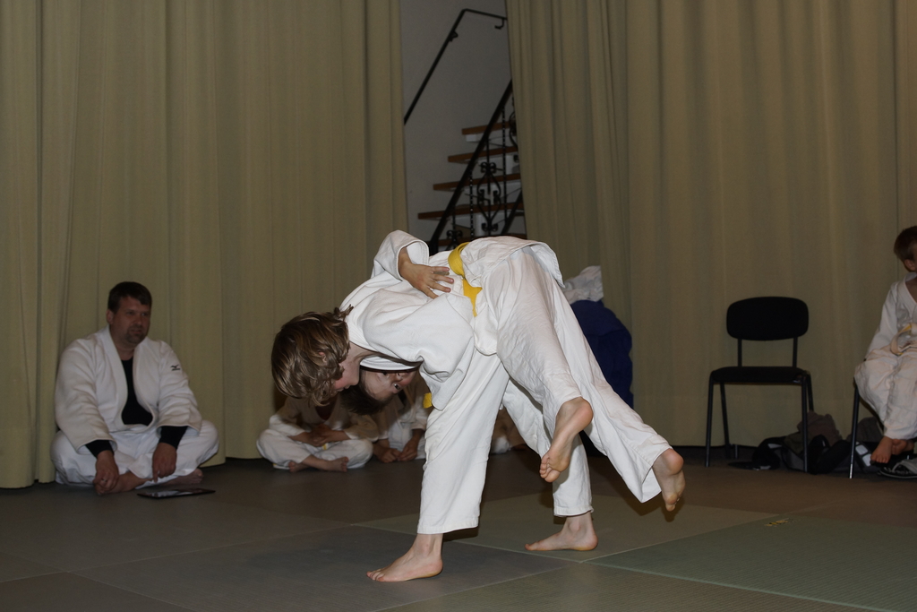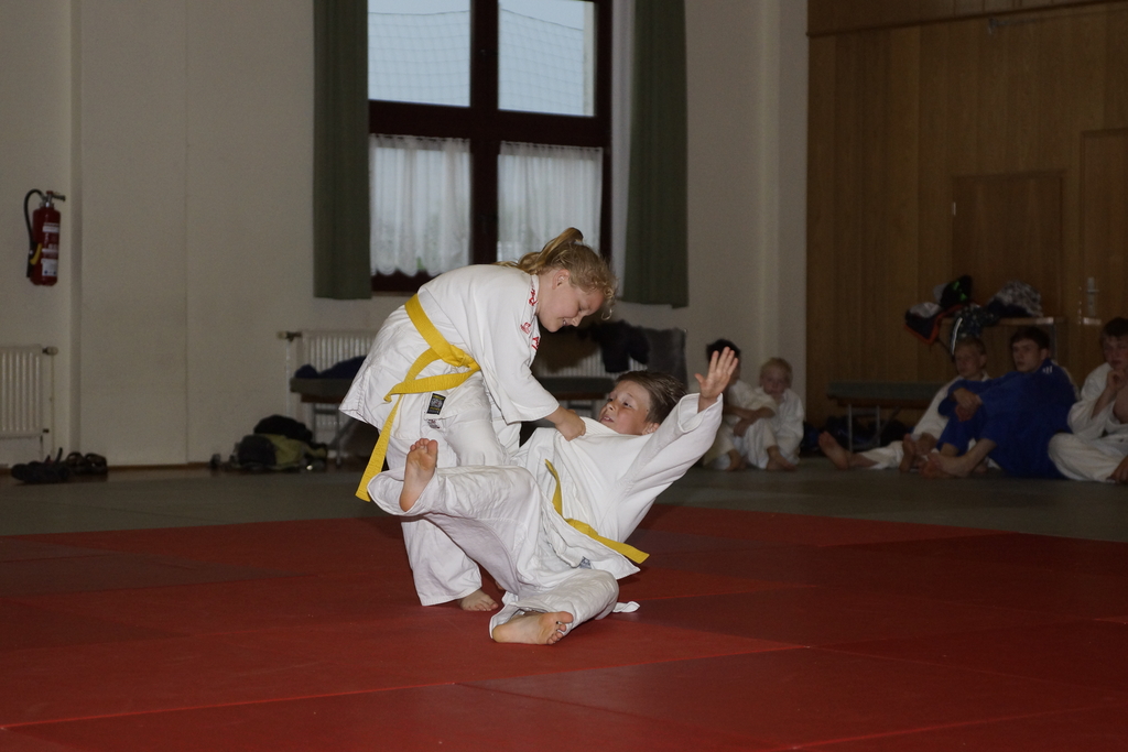 Dann ging es für die Ersten zur Kyu-Prüfung. Geprüft wurden die Anwärter auf den 8. (Gürtel weiß/ gelb), den 7. (Gürtel gelb) und den 6.Kyu (Gürtel gelb/orange). Zwei „Experten“, welche den gelben Gürtel ablegen wollten, dürfen dies im Herbst noch einmal probieren und die vier Kandidaten, welche sich für den 6.Kyu vorstellten, durften dies am Nachmittag noch einmal versuchen. Nach dem Mittagessen und einer Mittagsruhe wurden dann die höheren Kyu-Grade abgefragt. Vom orangenen Gürtel (V.Kyu) bis zu braunen Gürtel (I.Kyu) war alles dabei. Und natürlich die vier Prüflinge vom Vormittag. Diese schafften es diesmal und dürfen nun den gelb-orangen Gürtel tragen. Alle anderen Prüflinge zeigten gute bis sehr gute Leistungen und haben ihre Prüfungen mit Bravour bestanden. Mit Patricia Sprunk hat der JC Gornau in seinen Reihen die bisherige jüngste Trägerin des I.Kyu (brauner Gürtel). Für die Eltern der Kinder hatten das Orga-Team um Stephan Henz etwas Besonderes vorbereitet. So konnte, wer wollte, von Sonnabend bis Montag jeweils für eine Stunde ein Kurs in Selbstverteidigung absolviert werden. Dieses Angebot wurde dankbar und in großer Anzahl in Anspruch genommen. Nach dem Abendbrot, einer zünftigen Soljanka, wurden an die Prüflinge die Urkunden für den neuen Kyu-Grad überreicht und danach schaute man dann einen Film über das Lagerthema.