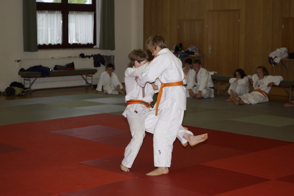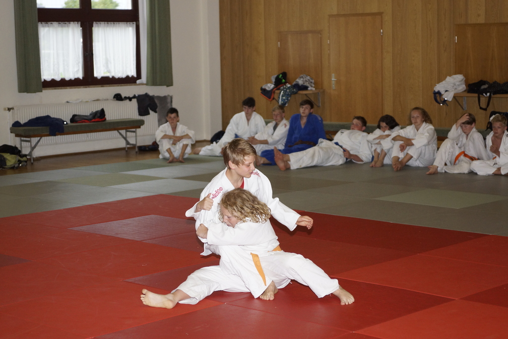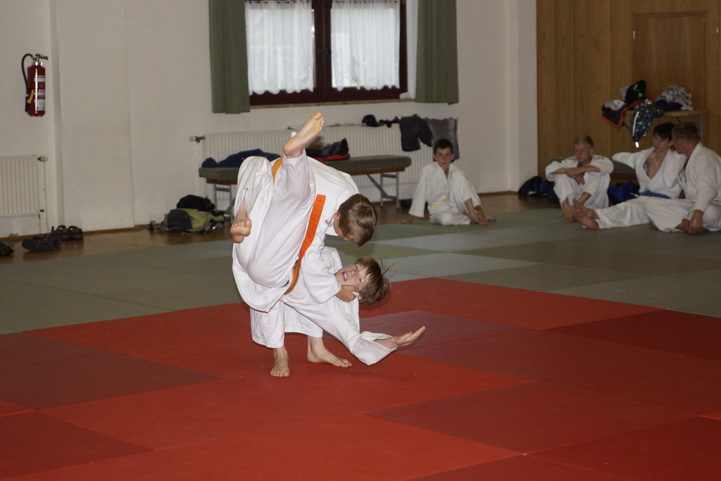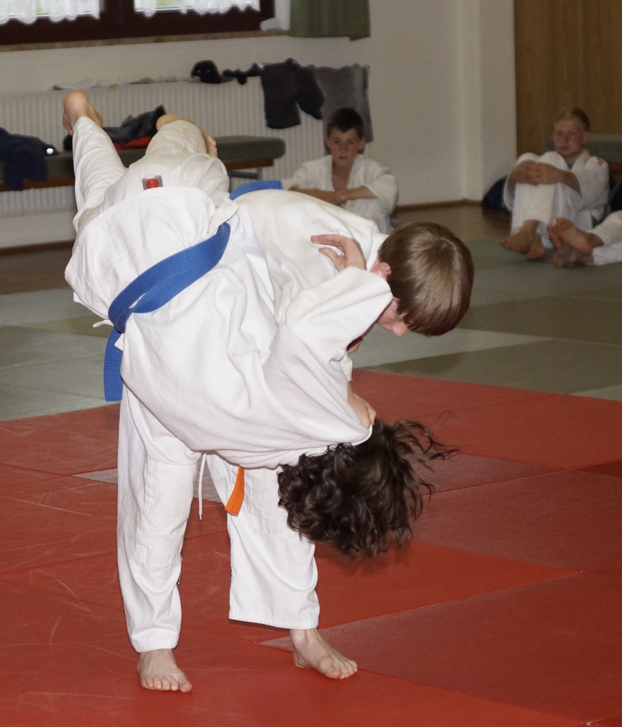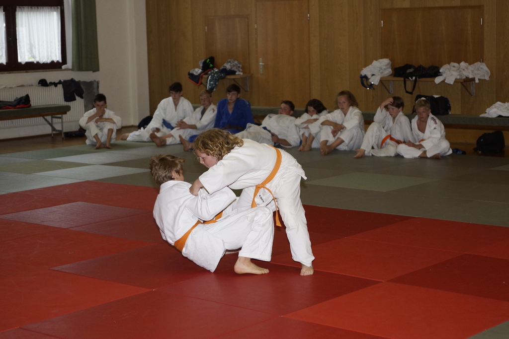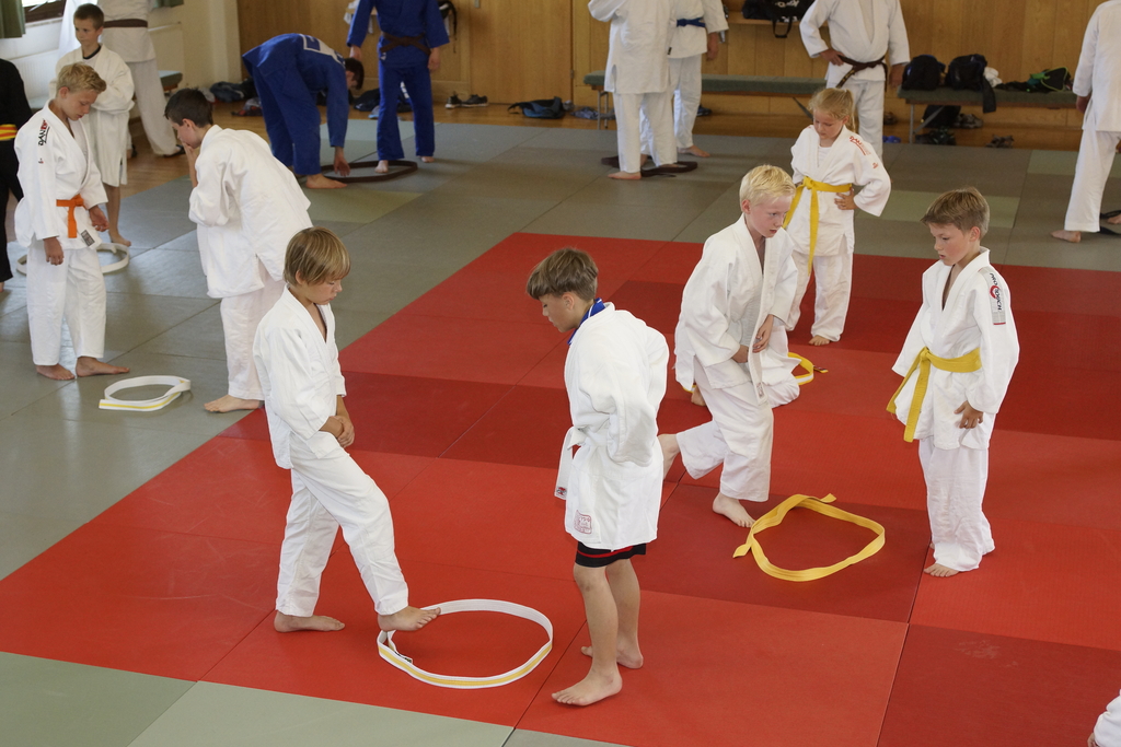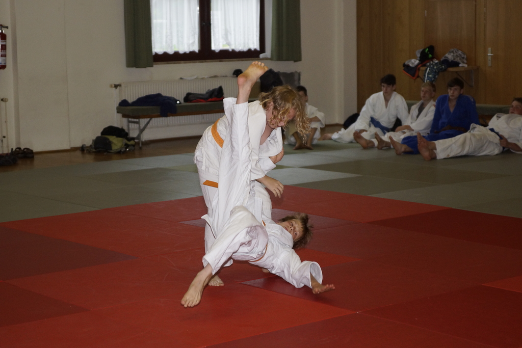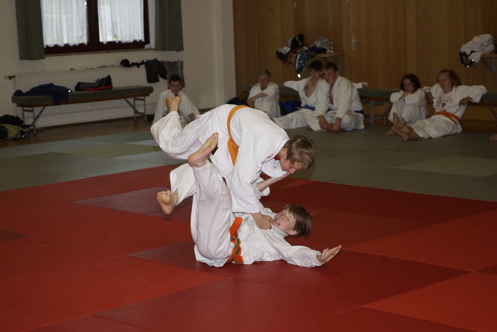 Der Montag stand dann ganz im Zeichen der „Budo-Safari“. Am Vormittag absolvierten die Judoka den leichtathletischen Teil wie Wurf/ Sprung und Lauf. Nach dem Mittagessen und dem obligatorischen „Ausruhen“ hieß es dann in der Halle „Hajime“ beim japanischen Randori der einzelnen Gruppen. Die besten Leistungen erzielten dabei Fritz Bauer, Carlotta Oertel und Justin Baumann. Nach den „heißen“ Randoris kühlte man sich im Freibad wieder ab. Zur „Budo-Safari“ gehörte auch ein kreativer Teil, welcher mit Judo bzw. dem Thema des Lager zu tun haben sollte. Hier glänzten Carlotta Oertel mit einem Gedicht und Charlize Richter mit dem Nachbau eines bunten Huhnes.