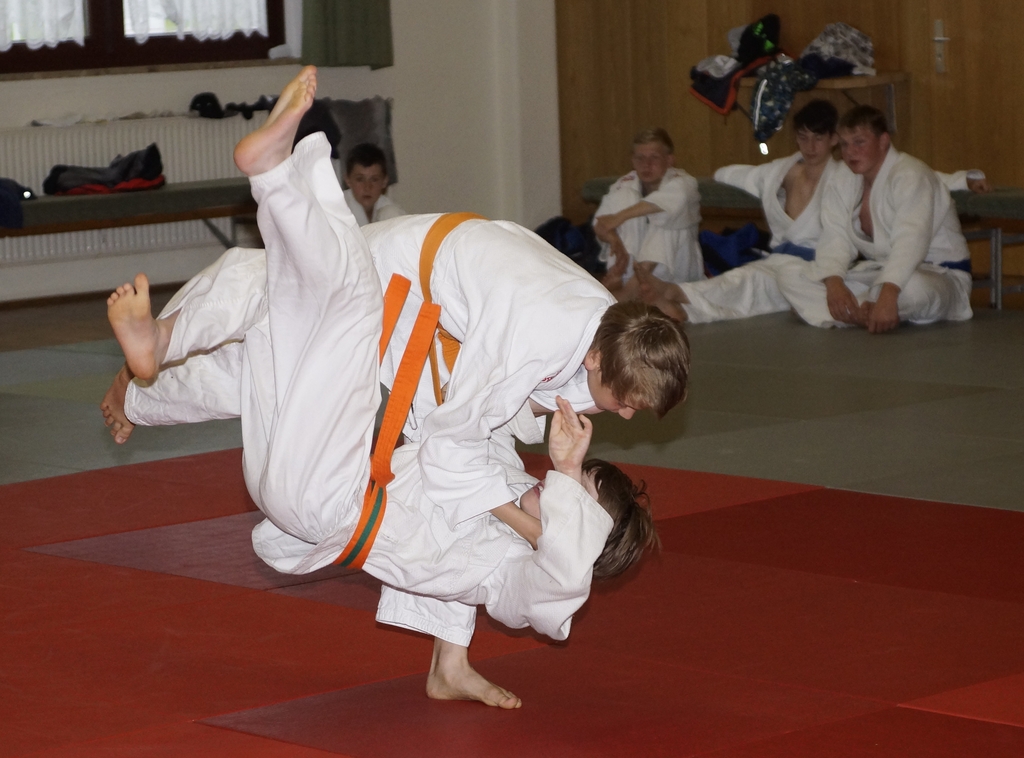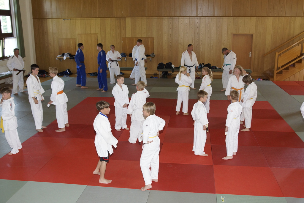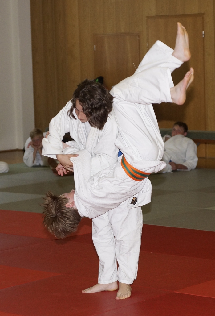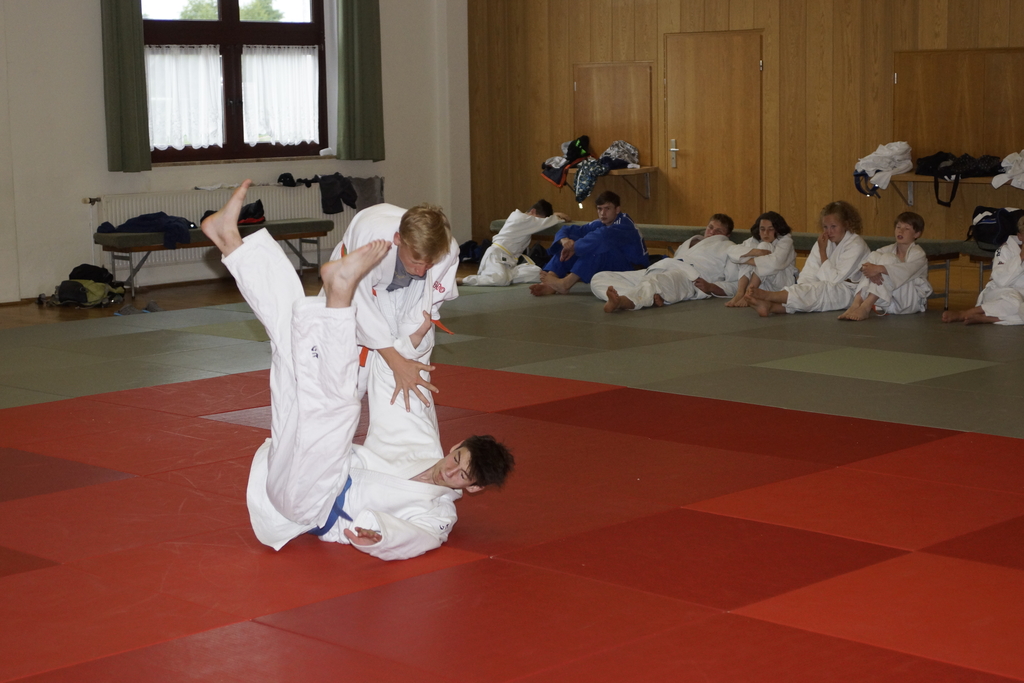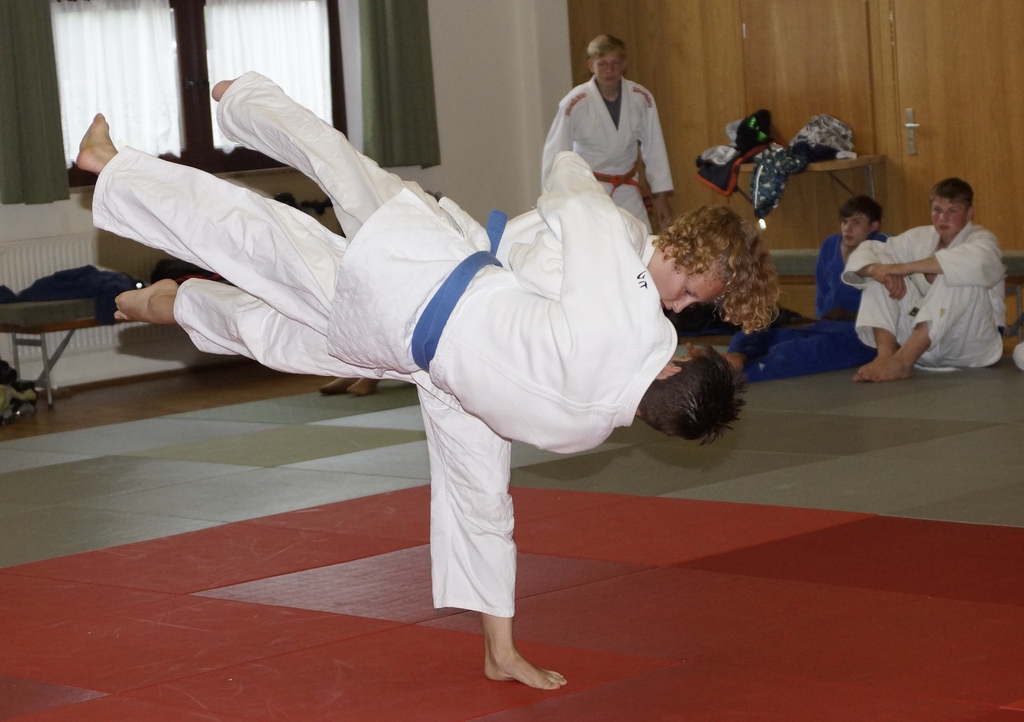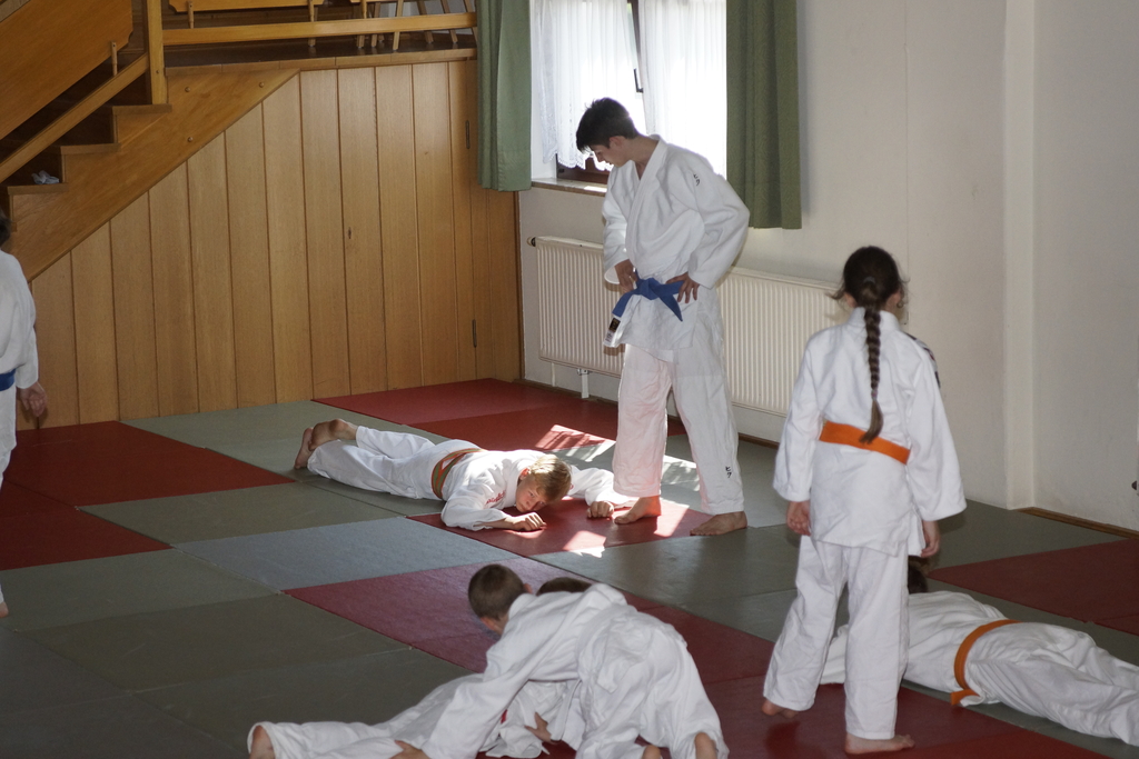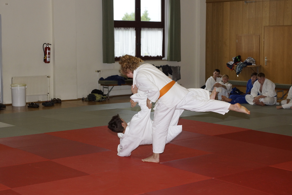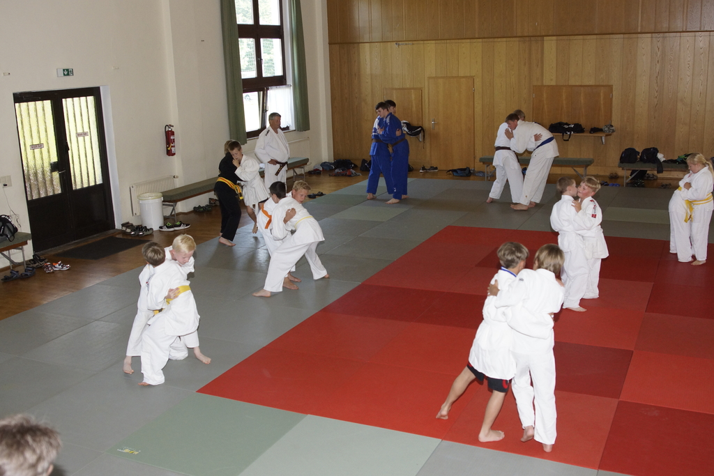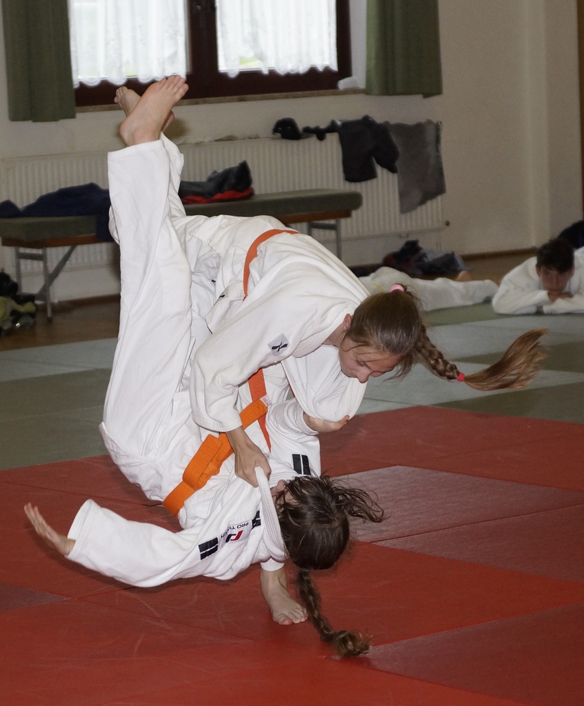 Der Montag stand dann ganz im Zeichen der „Budo-Safari“. Am Vormittag absolvierten die Judoka den leichtathletischen Teil wie Wurf/ Sprung und Lauf. Nach dem Mittagessen und dem obligatorischen „Ausruhen“ hieß es dann in der Halle „Hajime“ beim japanischen Randori der einzelnen Gruppen. Die besten Leistungen erzielten dabei Fritz Bauer, Carlotta Oertel und Justin Baumann. Nach den „heißen“ Randoris kühlte man sich im Freibad wieder ab. Zur „Budo-Safari“ gehörte auch ein kreativer Teil, welcher mit Judo bzw. dem Thema des Lager zu tun haben sollte. Hier glänzten Carlotta Oertel mit einem Gedicht und Charlize Richter mit dem Nachbau eines bunten Huhnes.