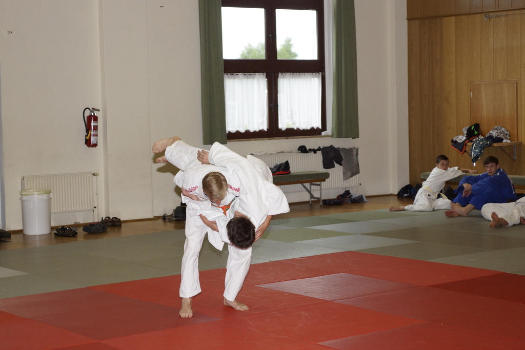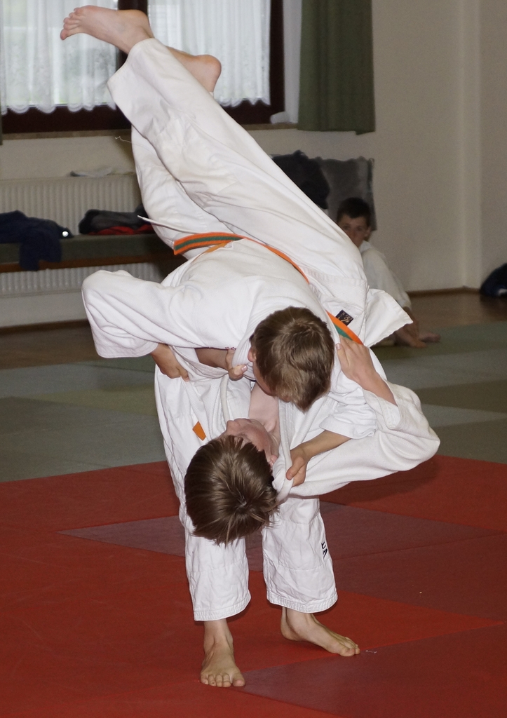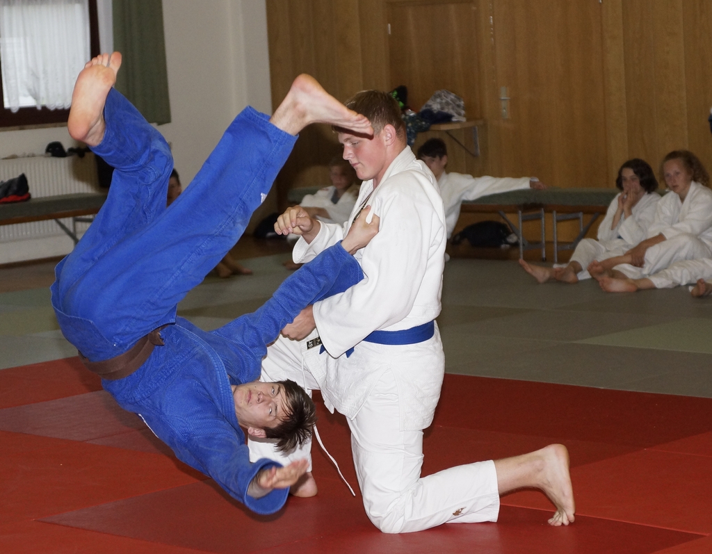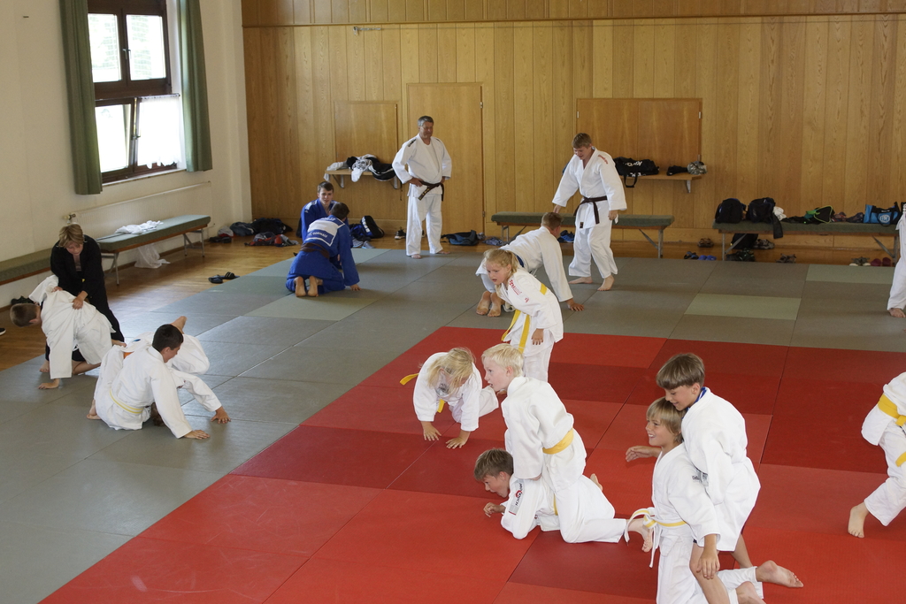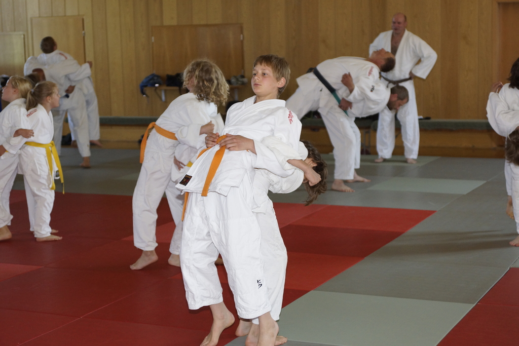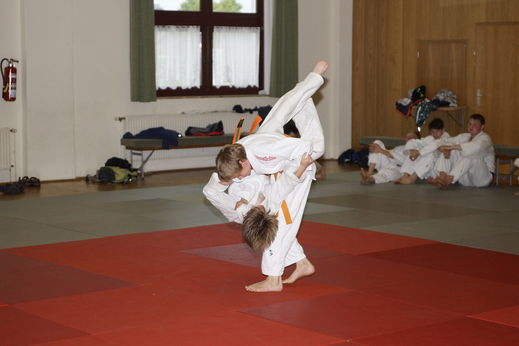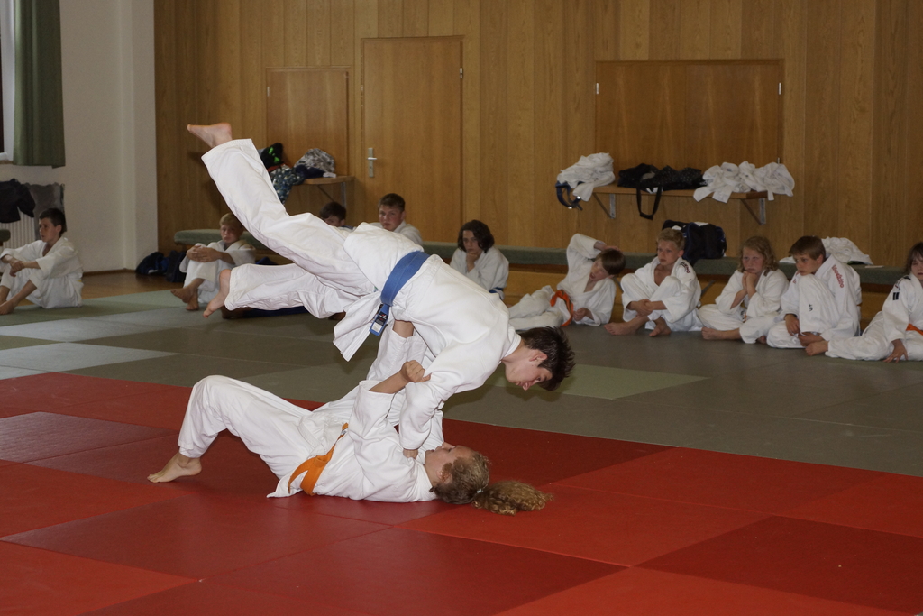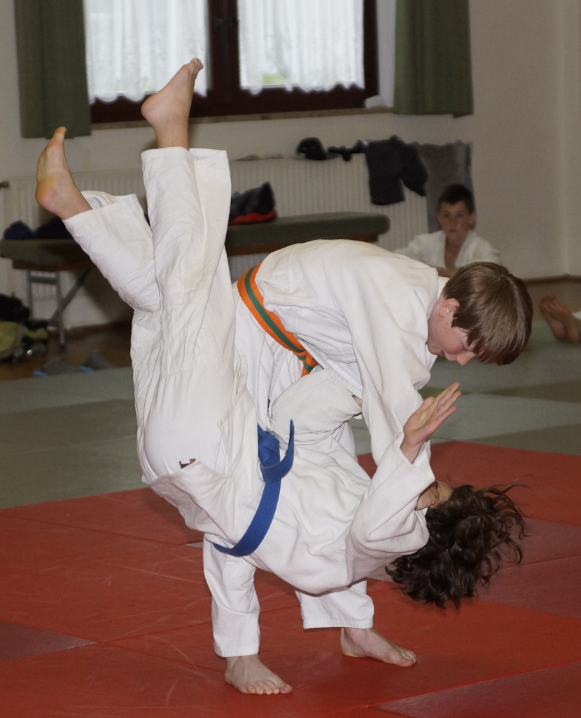 Der Montag stand dann ganz im Zeichen der „Budo-Safari“. Am Vormittag absolvierten die Judoka den leichtathletischen Teil wie Wurf/ Sprung und Lauf. Nach dem Mittagessen und dem obligatorischen „Ausruhen“ hieß es dann in der Halle „Hajime“ beim japanischen Randori der einzelnen Gruppen. Die besten Leistungen erzielten dabei Fritz Bauer, Carlotta Oertel und Justin Baumann. Nach den „heißen“ Randoris kühlte man sich im Freibad wieder ab. Zur „Budo-Safari“ gehörte auch ein kreativer Teil, welcher mit Judo bzw. dem Thema des Lager zu tun haben sollte. Hier glänzten Carlotta Oertel mit einem Gedicht und Charlize Richter mit dem Nachbau eines bunten Huhnes.
