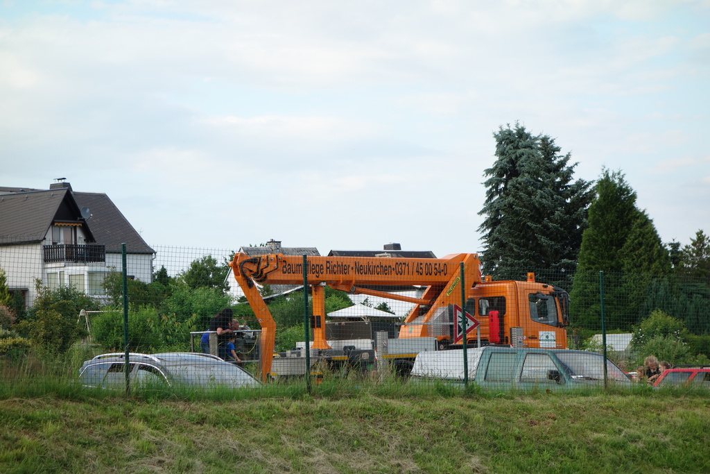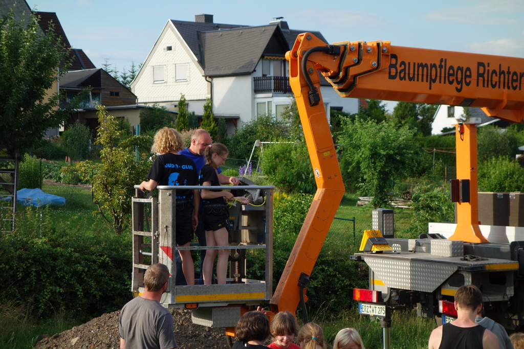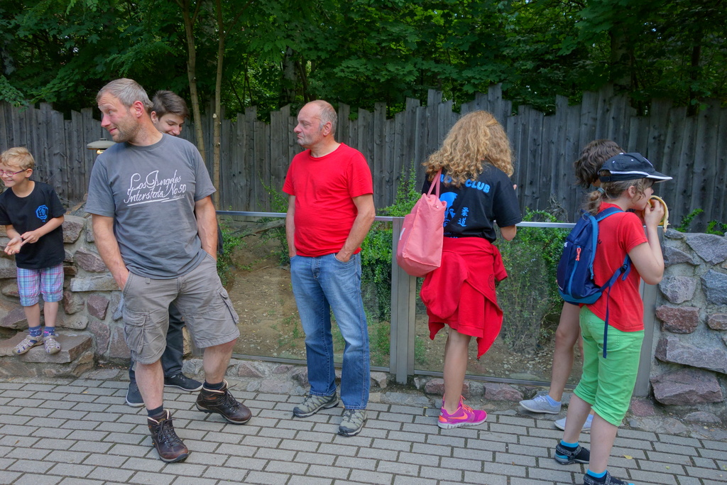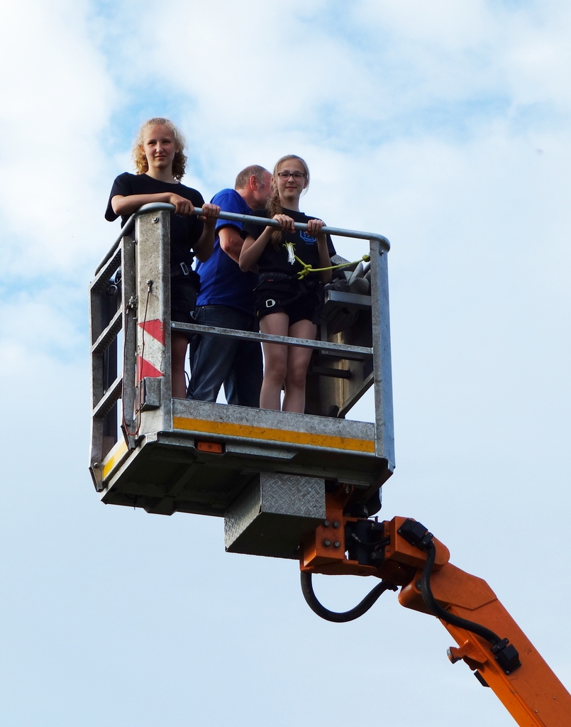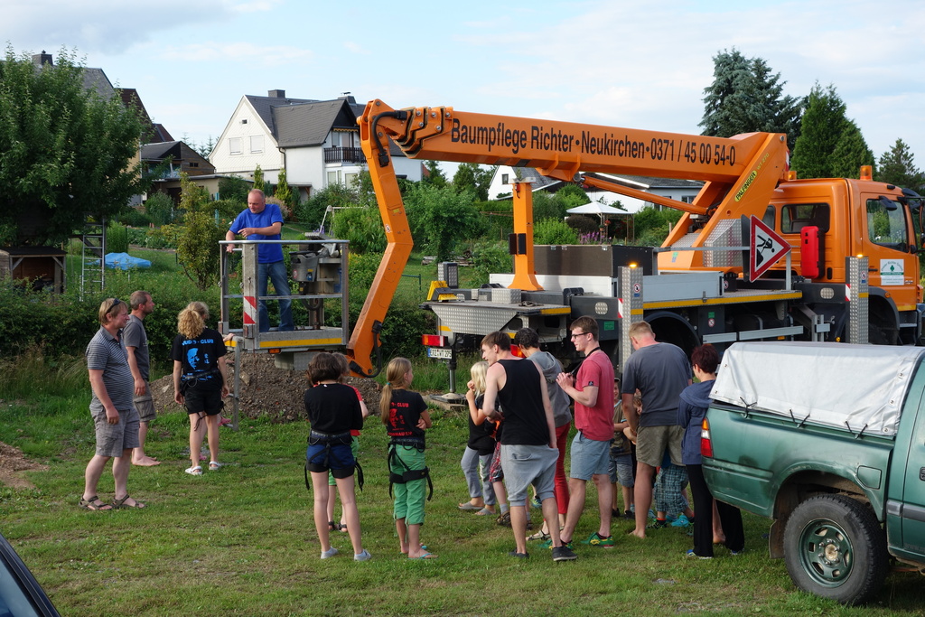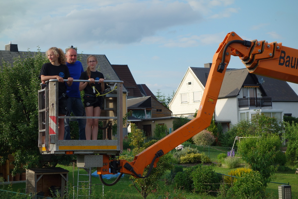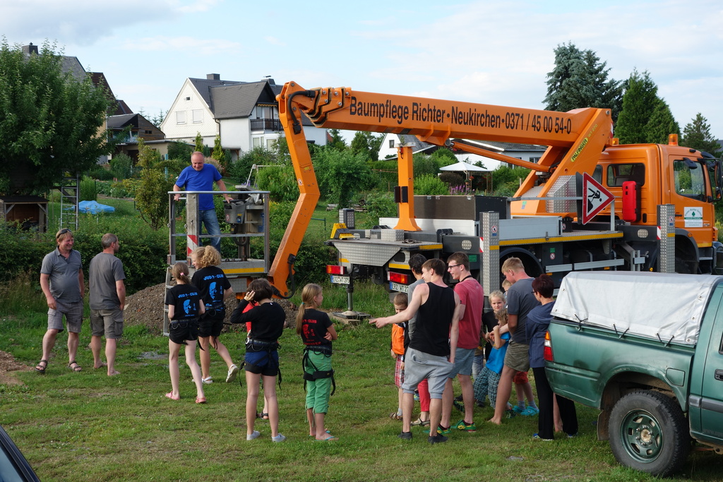 Nach dem Frühstück fuhr am Sonntag das gesamte Lager, außer unseren Küchenfeen, nach Chemnitz und besuchte in Rabenstein den dortigen Zoo. Für viele war es der erste Besuch dort überhaupt und von den Erwachsenen waren auch viele sehr lange nicht dort und so gab es viel Neues zu bestaunen. Als man am Nachmittag im Camp eintraf badete man ausgiebig und dann wurden die Eltern begrüßt, welche zum Familientag eingetroffen waren. Highlight war natürlich die Fahrt mit einer Hebebühne der Fa. Richter-Baumpflege aus Neukirchen. In einer Kabine ging es, gut angeschnallt und gesichert, bis zu 27 Meter in die Höhe und da kamen selbst die Erwachsenen aus dem Staunen nicht heraus. Der Ausblick war überwältigend. Später ging es, nach einem ausgiebigen Grillabend, mit der Aufnahmeprüfung der „Wilden Hühner“ weiter, was eine ziemlich feuchte Angelegenheit war.
