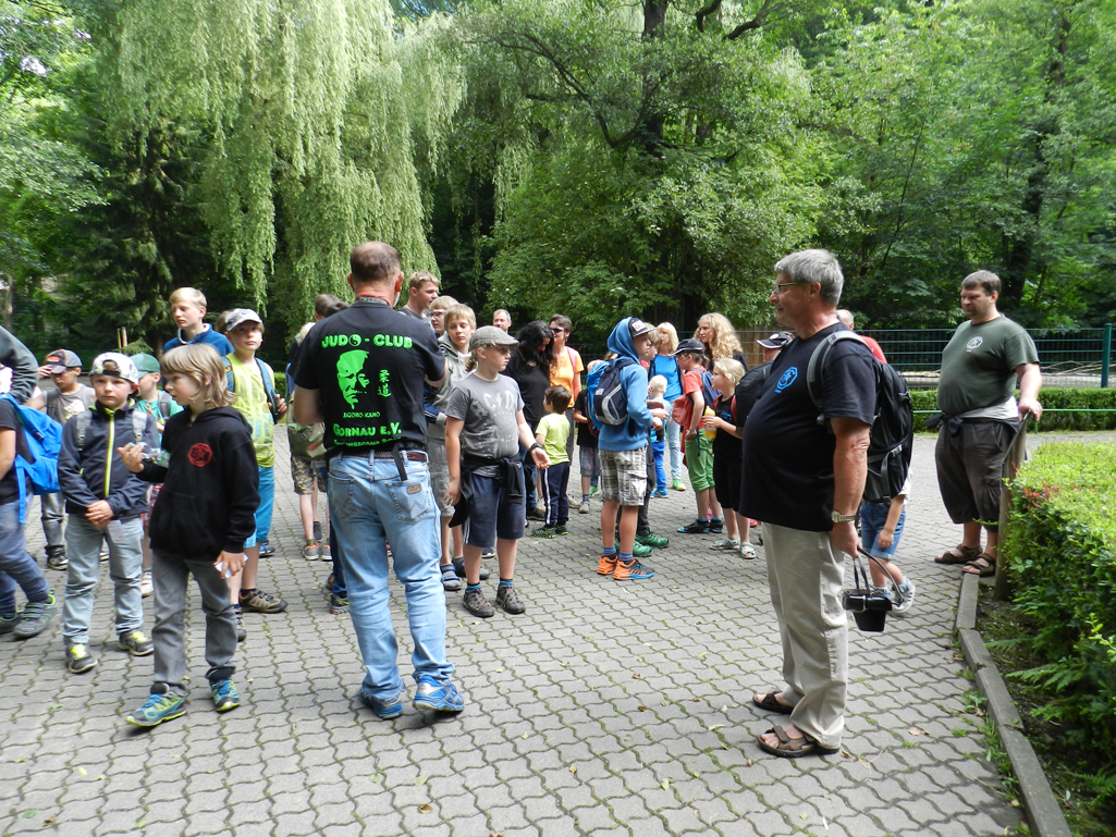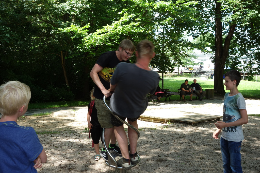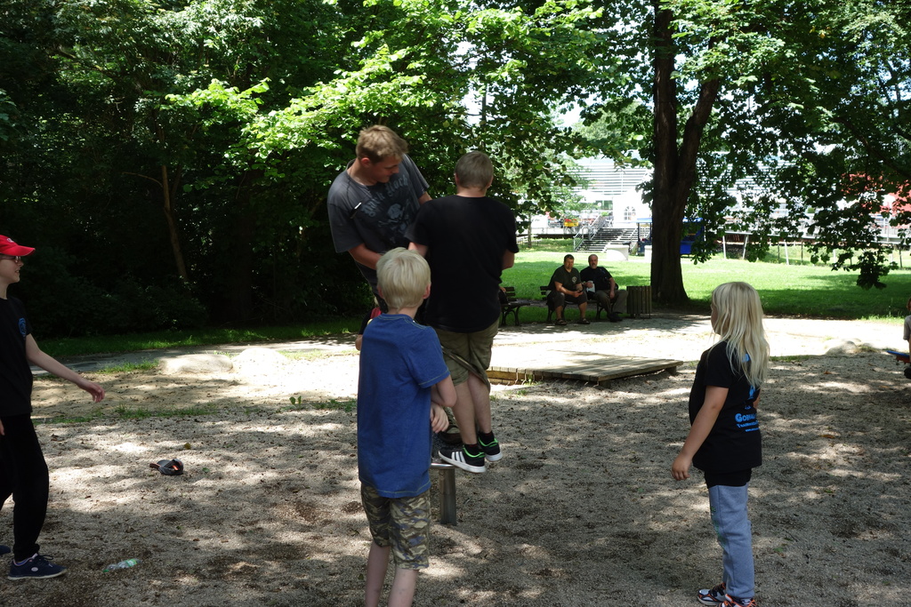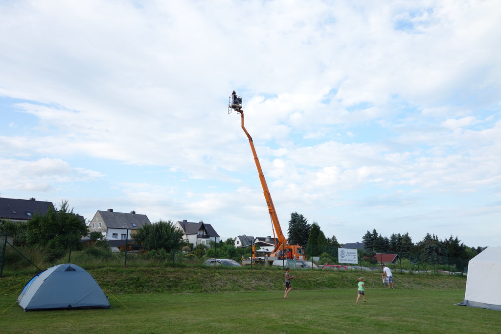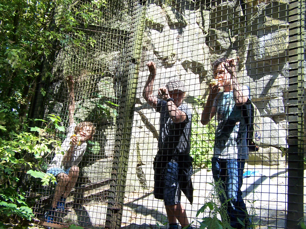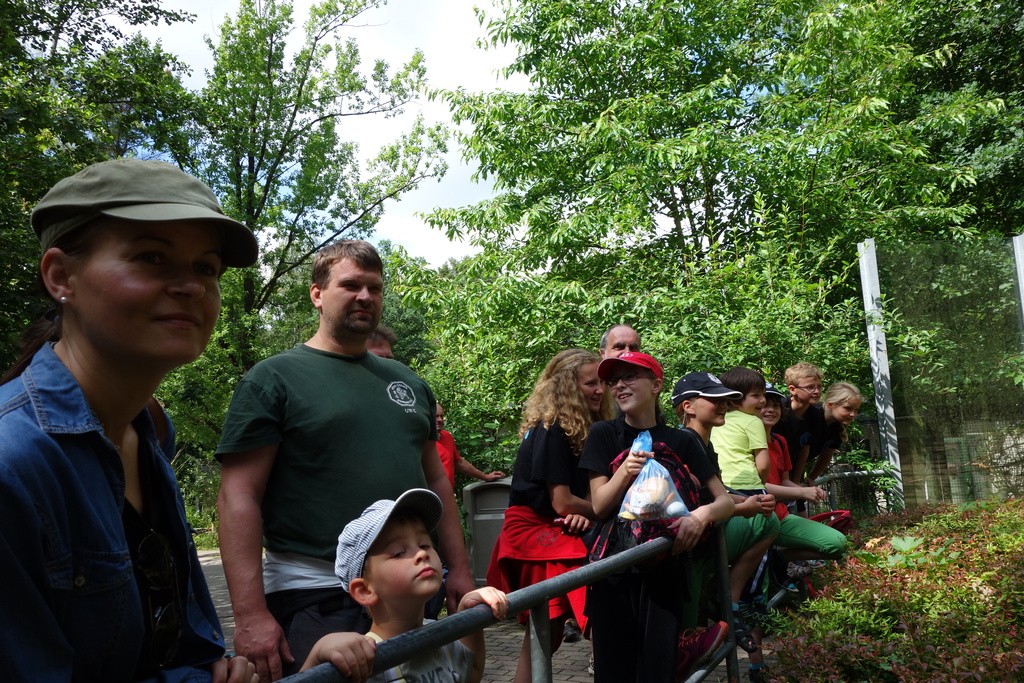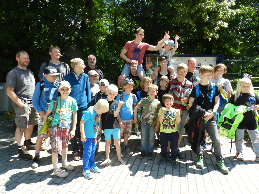 Nach dem Frühstück fuhr am Sonntag das gesamte Lager, außer unseren Küchenfeen, nach Chemnitz und besuchte in Rabenstein den dortigen Zoo. Für viele war es der erste Besuch dort überhaupt und von den Erwachsenen waren auch viele sehr lange nicht dort und so gab es viel Neues zu bestaunen. Als man am Nachmittag im Camp eintraf badete man ausgiebig und dann wurden die Eltern begrüßt, welche zum Familientag eingetroffen waren. Highlight war natürlich die Fahrt mit einer Hebebühne der Fa. Richter-Baumpflege aus Neukirchen. In einer Kabine ging es, gut angeschnallt und gesichert, bis zu 27 Meter in die Höhe und da kamen selbst die Erwachsenen aus dem Staunen nicht heraus. Der Ausblick war überwältigend. Später ging es, nach einem ausgiebigen Grillabend, mit der Aufnahmeprüfung der „Wilden Hühner“ weiter, was eine ziemlich feuchte Angelegenheit war.