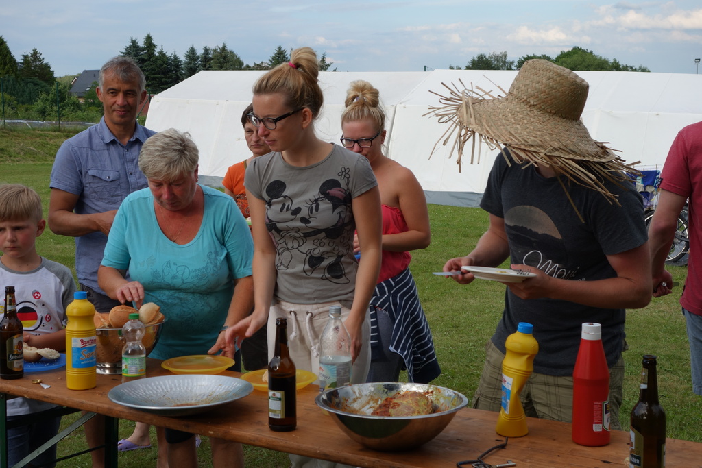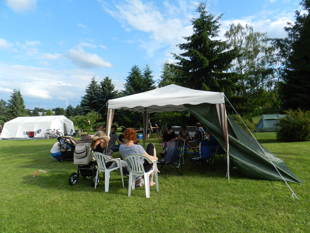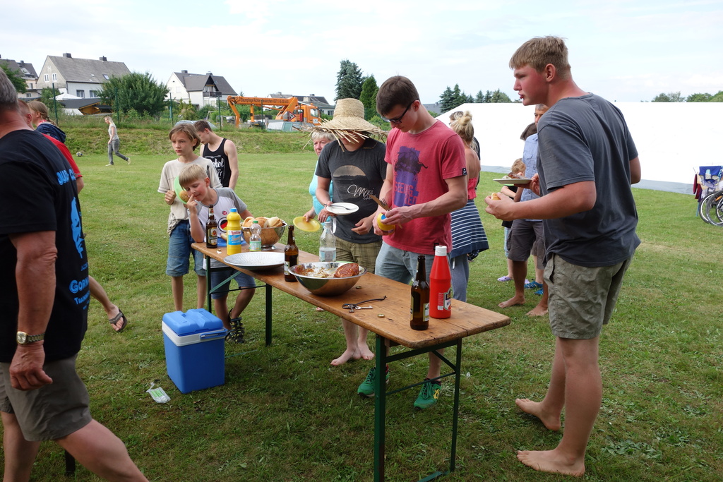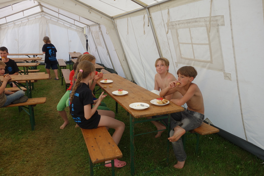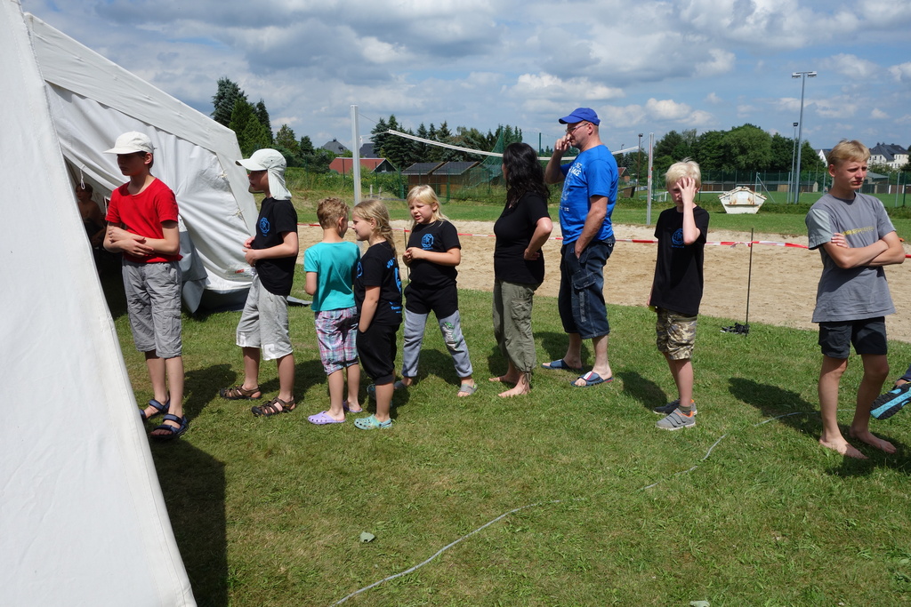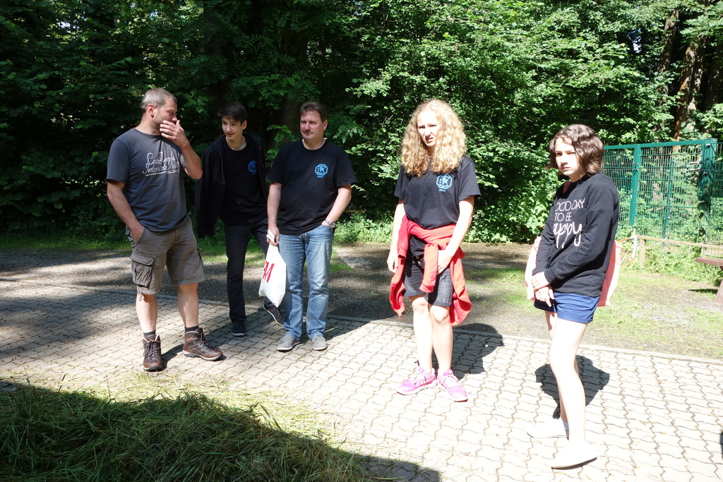 Der Sonnabend begann mit einem deftigem Frühstück, Einweisung der Campteilnehmer in den Ablauf und das Thema des Lagers „Die wilden Hühner und die Pygmäengang von Gornau“, sowie der Lagerordnung und die Aufteilung der Gruppen.