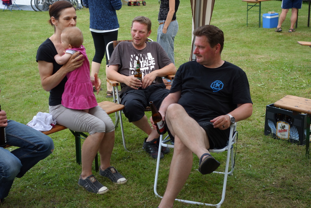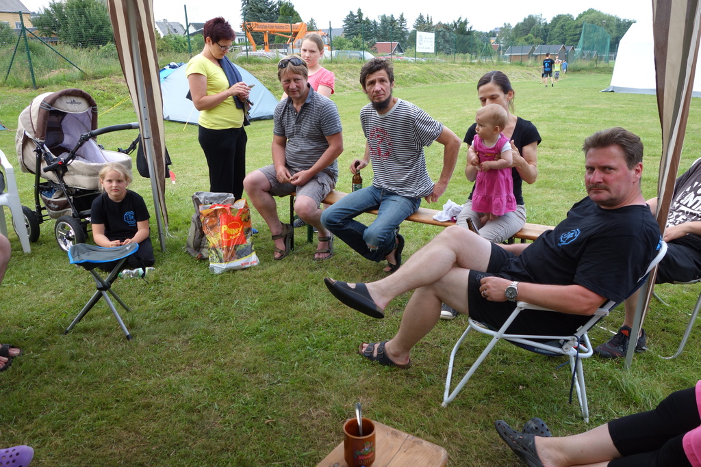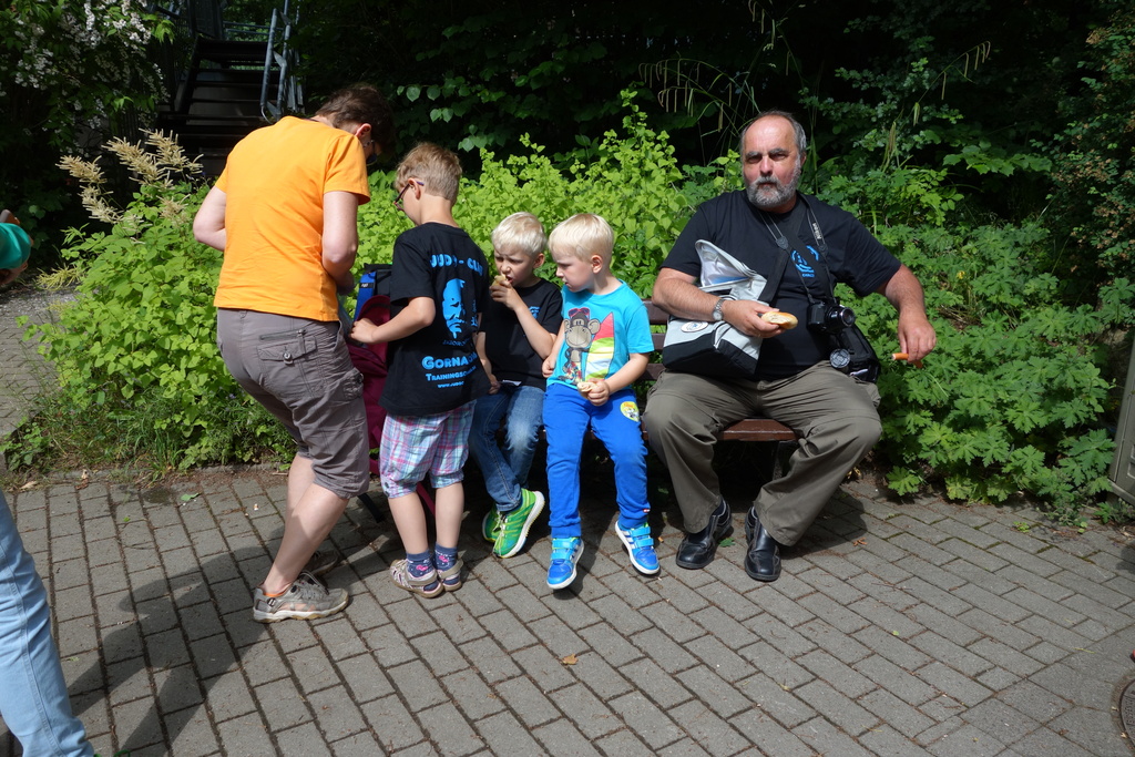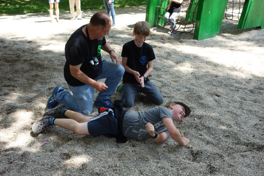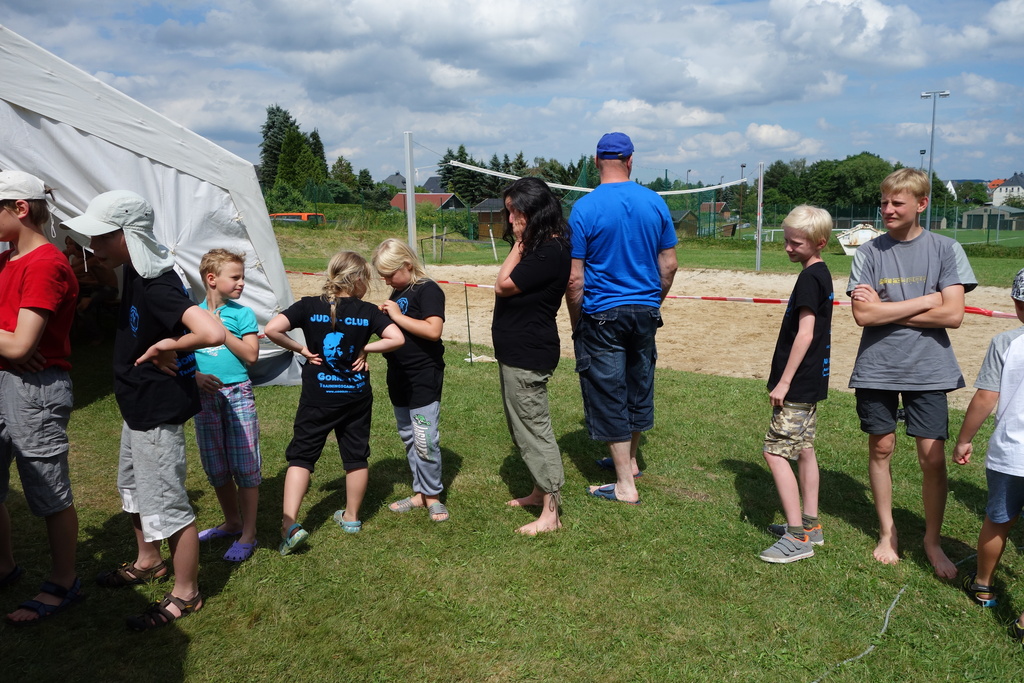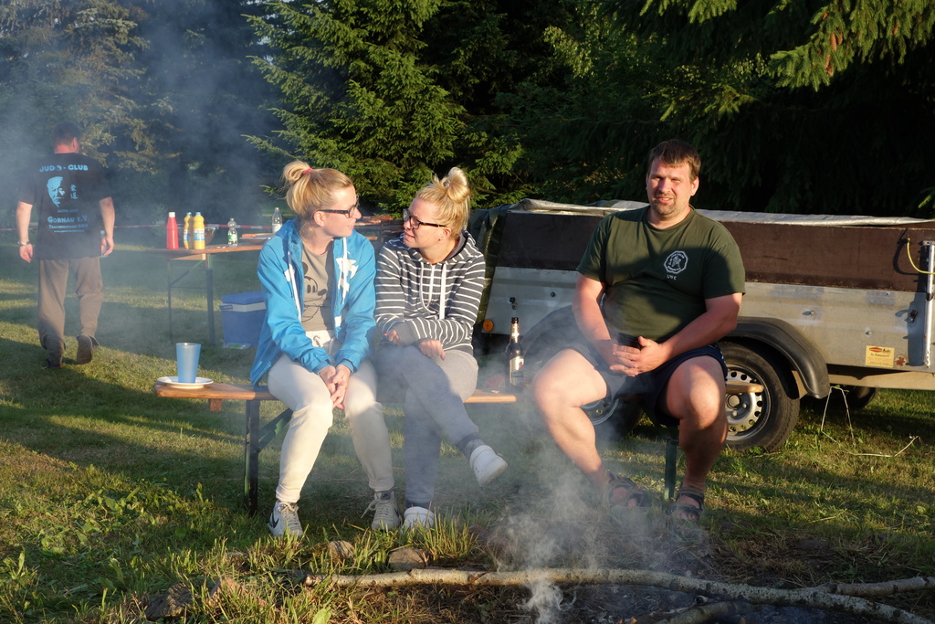 Natürlich hatten auch die „Gornauer Pygmäen“ ihr Aufnahmeritual zu absolvieren und das war auch nicht ganz einfach. Das ORGA-Team hatte noch einen weiteren Höhepunkt geplant. Gegen 16.00 Uhr hieß es mit einem Mal „Feuer!!!!!“ und Alles rannte zum Sanitärtrackt des Freibades, welcher als Sammelpunkt bei derartigen Sachen zur Einweisung benannt wurde. Das geschah so schnell und geordnet, dass sogar einige offizielle Badegäste des Freibades vorsorglich mit rannten und sich auch mit aufstellten. Das „Feuer“ war natürlich kein Solches, sondern nur als eine Übung gedacht und die Kameraden der Freiwilligen Feuerwehr warteten schon um die Ecke. Sie kamen sogar mit kurzem Sondersignal. Das war natürlich etwas ganz Aufregendes für unsere, hauptsächlich kleinen Judoka, und auch die Größeren erfuhren von den Kameraden viele wissenswerte Details über die Arbeit der Feuerwehr. So konnten sie das Innere des Fahrzeuges bestaunen, sich hineinsetzen, ihnen wurde der Aufbau sowie der Ablauf eines Einsatzes erklärt und vieles mehr. Dafür an dieser Stelle noch einmal ein herzliches Dankeschön an die Kameraden der Freiwilligen Feuerwehr Gornau, welche dies ermöglicht haben. Der Abend klang dann beim schon legendären „Schmuggler-Spiel“ aus.